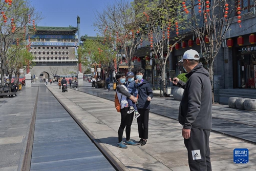 市民在北京前門大街拍照留念(2020年4月12日攝)。新華社記者 彭子洋 攝