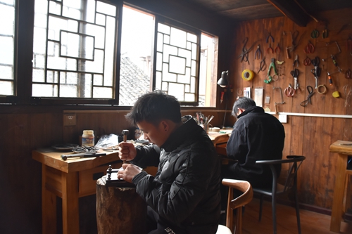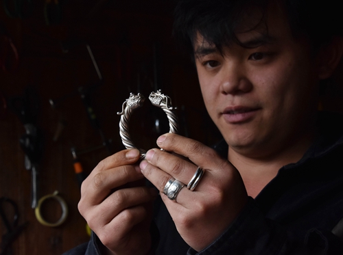 “最近訂單多得不行,都是要過春節(jié)和大家從外面回家了嘛,有定制結(jié)婚戒子的、手鐲的、耳環(huán)和銀飾嫁妝的,也有定制春節(jié)參加活動(dòng)表演服的,我們都在加班加點(diǎn)趕工?!迸耸藢W(xué)銀匠說,從1月初到現(xiàn)在,麻料銀匠村的“藝術(shù)空間”工坊十幾個(gè)工匠不分晝夜地改制訂單。