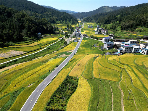 圖為巨寨村連片種植的優(yōu)質(zhì)稻陸續(xù)進入成熟期,稻谷金黃,豐收在望,隨處可見豐收景色。(楊波 龍景輝 攝)