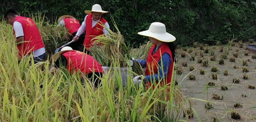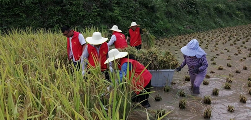 金色的稻田里,黨員志愿者身穿“紅馬甲”個(gè)個(gè)干勁十足,充分發(fā)揚(yáng)不怕苦、不怕累、不怕臟的精神,穿梭在田間水上,任由稻田的泥水沾滿(mǎn)了衣衫,幫助村民搶收稻谷。在金色的稻田間,鮮紅的黨旗、豐收的稻谷和黨員們臉上的笑容交相輝映,形成了一道金秋豐收、黨群情深的亮麗風(fēng)景。