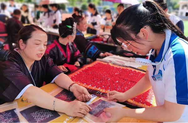 “苗族錫繡,當(dāng)時(shí)有人發(fā)現(xiàn)錫與銀子的色澤相似,純潔度喜人,因?yàn)橛胁灰妆谎趸奶刭|(zhì),于是苗族先人就把錫用于苗族的刺繡上,這也是具有清廉的一種象征?!泵耖g非遺文化傳承人王亨石在民族文化進(jìn)校園活動(dòng)中輔導(dǎo)學(xué)生時(shí)說。