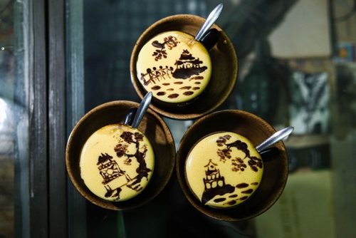 ↑這是2023年7月22日在越南河內(nèi)一家咖啡店拍攝的繪制河內(nèi)風(fēng)光圖案的雞蛋咖啡。越南特色飲品雞蛋咖啡由蛋黃、糖、煉乳和咖啡等原料制成,其獨(dú)特的風(fēng)味受到當(dāng)?shù)孛癖姾屯鈬慰拖矏?。新華社發(fā)(范庭德攝)