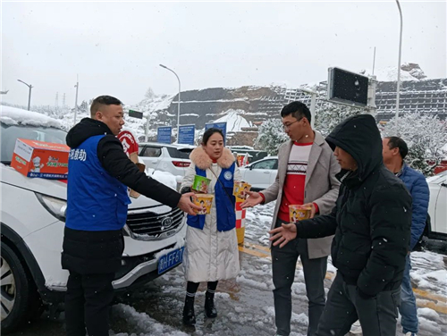 岑鞏縣民政局工作人員向高速路口滯留司乘人員發(fā)放方便面。(楊敏 攝)