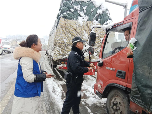 岑鞏縣高速公路口,岑鞏縣民政部門工作人員與公安民警一起通知滯留司乘人員到臨時(shí)救助點(diǎn)領(lǐng)取基本生活物資。(楊敏 攝)