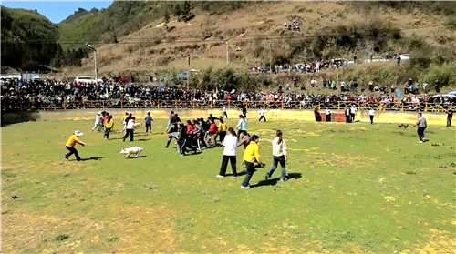 在捉豬、捉雞現(xiàn)場,小豬、大公雞在田壩里東奔西跑,婦女們使出全身力氣追趕,有的快準狠一把抓住,有的彎腰撲空,惹得田坎上觀眾們捧腹大笑。