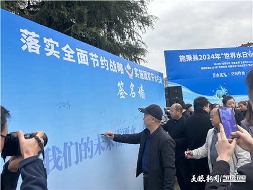 活動(dòng)中,300多名干部群眾一起在印有“落實(shí)全面節(jié)約戰(zhàn)略,實(shí)施國(guó)家節(jié)水行動(dòng)”的簽名墻上鄭重簽名,表達(dá)了關(guān)心水、愛(ài)惜水、保護(hù)水的志愿與決心?;顒?dòng)現(xiàn)場(chǎng)進(jìn)行了水資水保、安全生產(chǎn)、水旱災(zāi)害防御、水利工程建設(shè)、供排水、河長(zhǎng)制管理工作宣傳,累計(jì)發(fā)放各類宣傳資料1000余份?,F(xiàn)場(chǎng)發(fā)布了施秉縣節(jié)水宣傳“五進(jìn)”“世界水日”“中國(guó)水周”有獎(jiǎng)答題以及“千城地標(biāo)亮節(jié)水”等系列活動(dòng),進(jìn)一步宣傳節(jié)約用水、保護(hù)水資源的觀念,呼吁公眾成為節(jié)水護(hù)水的倡導(dǎo)者、踐行者和捍衛(wèi)者。