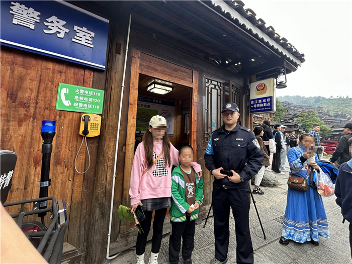 到達(dá)現(xiàn)場(chǎng)后,民警詢問得知,小男孩與父母趁此五一假期,從云南到西江千戶苗寨來游玩,在排隊(duì)買零食吃時(shí)與家人走散,小男孩情緒激動(dòng),啼哭不止。為了安撫小男孩的情緒,民警將他帶至警務(wù)室,并迅速想辦法聯(lián)系其家人。所幸走失兒童的母親在尋找小男孩時(shí),恰巧遇到正在巡邏的民警,在民警的幫助下,小男孩終于找到了家人。