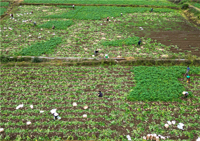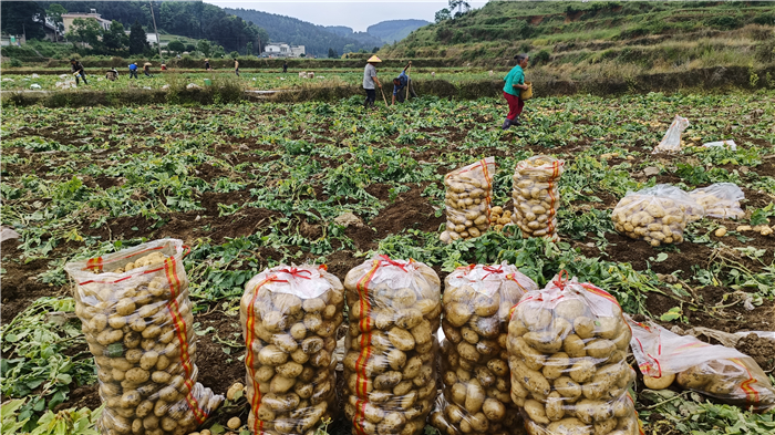 在天星鄉(xiāng)地城村馬鈴薯種植地里,只見綠油油的田野里人頭攢動,趁著晴好天氣,忙著搶收地里的馬鈴薯。隨著工人手起鋤落,一個個外觀飽滿、個頭勻稱的“金豆豆”從土里翻出,鋪滿田間地頭,工人們分工明確,忙碌有序,按照馬鈴薯的大小和品質(zhì)進(jìn)行分揀、裝袋,田間地頭呈現(xiàn)出一派喜人的豐收景象。
