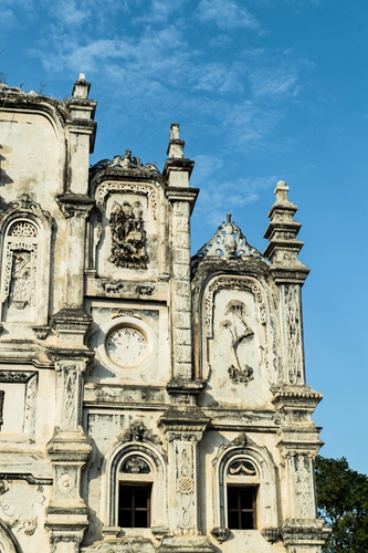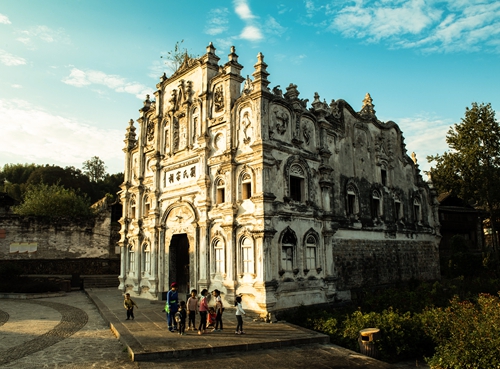 劉氏宗祠正面牌樓是一座哥特式風(fēng)格建造的建筑,坐北朝南,面寬12米,進(jìn)深14米,最高點12.5米,建筑面積320平方米。隔江望去,宛如一座西方教堂,又形似澳門的大三巴牌坊。