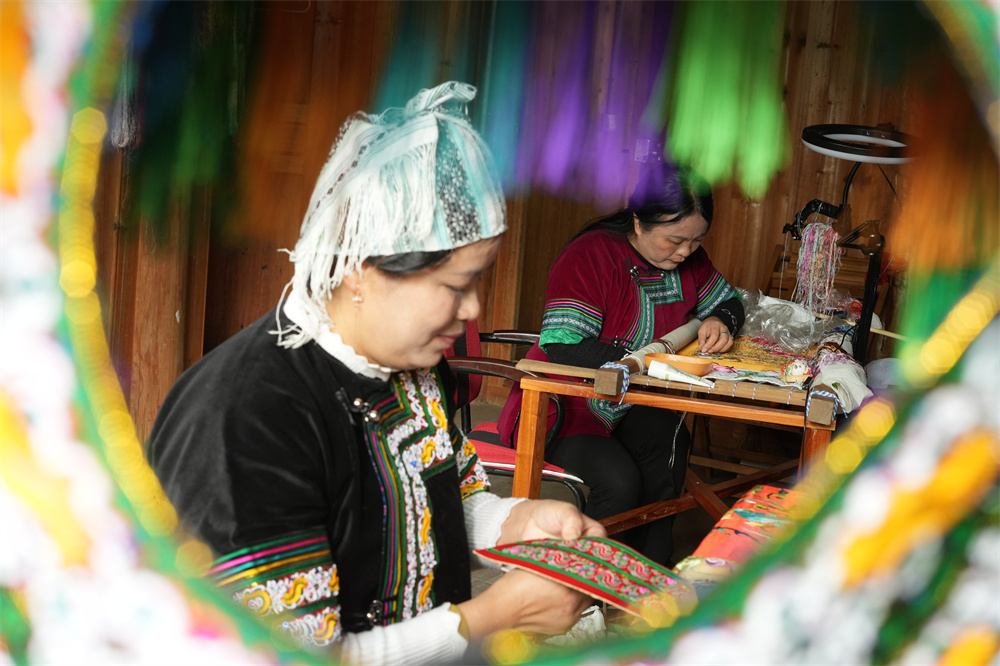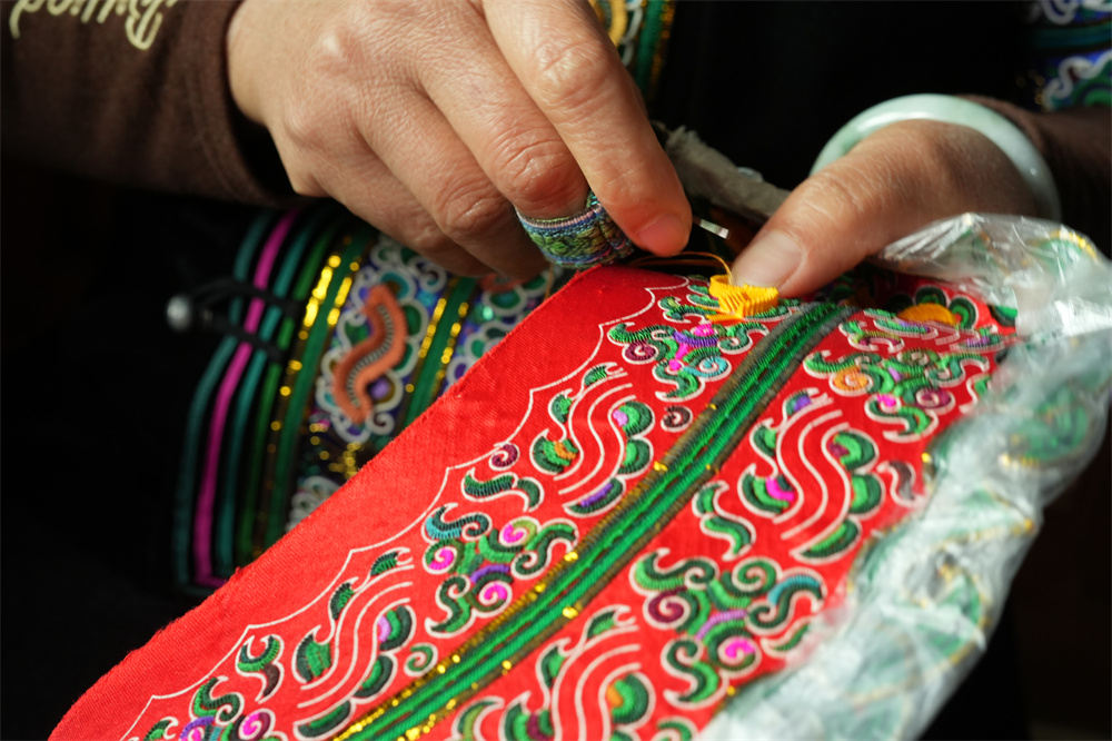 11月22日,在榕江縣朗洞鎮(zhèn)色邊村,繡娘在趕制刺繡訂單產(chǎn)品,供應(yīng)市場(chǎng)。