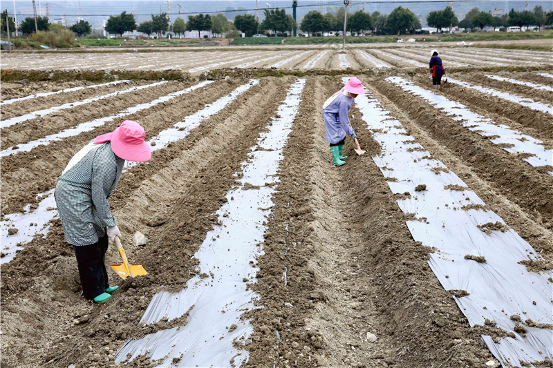 2024年12月17日,在貴州省黔東南苗族侗族自治州榕江縣古州鎮(zhèn)月寨村“榕江縣陽(yáng)光女子蔬菜種植農(nóng)民專(zhuān)業(yè)合作社”,社員在地里勞作。