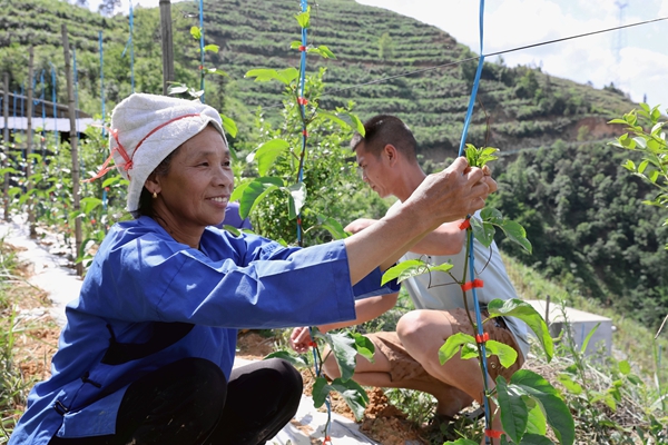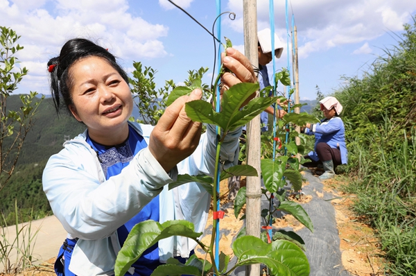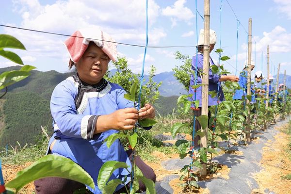 近日,在貴州省黔東南苗族侗族自治州榕江縣古州鎮(zhèn)月寨村種植的百香果種植基地,農(nóng)民正忙著給百香果除草、施肥、澆水、扎藤蔓等,百香果種植基地呈現(xiàn)勞作繁忙景象。