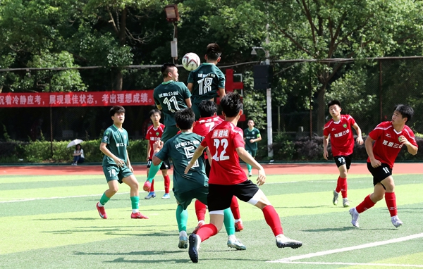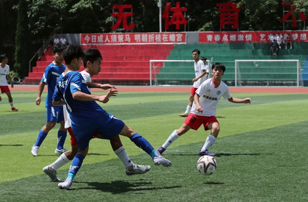2025年5月9日,在貴州省黔東南苗族侗族自治州榕江縣第一中學足球場,榕江縣第一中學足球隊員(綠衣)與凱里市第三中學足球隊員在比賽中拼搶。