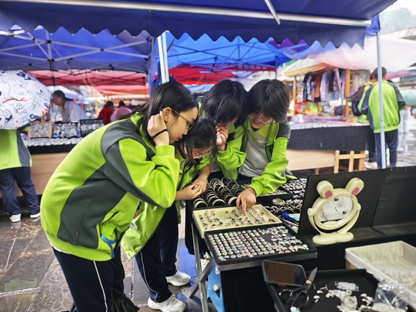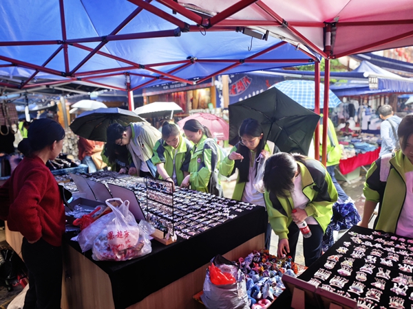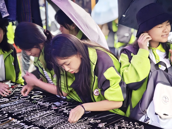 5月15日,盡管細(xì)雨如絲,苗侗風(fēng)情園繡里淘集市內(nèi)卻熱鬧非凡。幾個(gè)女同學(xué)輕輕撫摸著一件銀飾蝴蝶胸針,指尖觸碰到精致紋路時(shí),不禁發(fā)出驚嘆:“原來苗銀的鏨刻工藝竟需36道工序,每一刀都飽含著匠人對美的執(zhí)著追求?!备叨W(xué)生團(tuán)隊(duì)則圍在侗族刺繡傳承人吳阿婆身旁,認(rèn)真學(xué)習(xí)“數(shù)紗繡”技法,并嘗試在方巾上勾勒出凱里地標(biāo)“風(fēng)雨橋”。一位學(xué)生感慨道:“針腳歪了可以重來,但文化的傳承不能‘?dāng)嗑€’?!睂W(xué)生們的這些感悟,深刻折射出此次研學(xué)活動的深層價(jià)值。