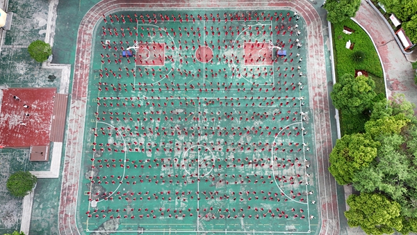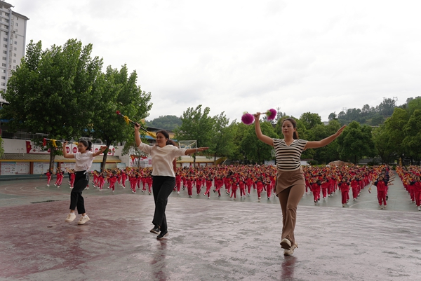 課間操時(shí)分,岑鞏縣第一小學(xué)的操場上一片歡騰。伴隨著輕快的民族音樂,學(xué)生們手持彩綢裝飾的金錢棍,或擊肩或點(diǎn)臂或敲腿,動作整齊有力。陽光下,翻飛的金錢棍發(fā)出清脆悅耳的聲響,孩子們靈動的身影與燦爛的笑容,讓這項(xiàng)非遺技藝在校園里綻放新活力。