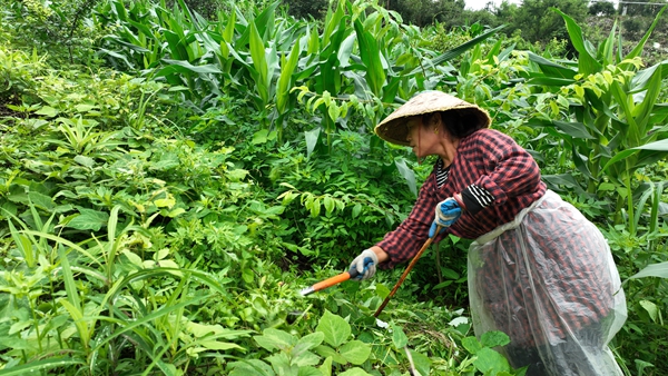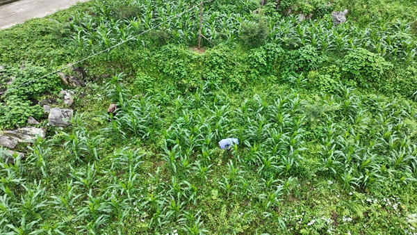 “農(nóng)業(yè)產(chǎn)業(yè),三分種七分管。當下正值雨水季節(jié),雜草生長旺盛,嚴重稀釋土壤營養(yǎng),影響土壤通透性,不利于玉米和黃精生長,需要及時除草、適當施肥,精細管護才能讓玉米和黃精既有‘品質(zhì)’又有‘顏值’?!饼?zhí)梁哟妩h支部書記、種植大戶楊軍朝介紹。黃精喜陰,玉米的生長周期為每年4—9月,與黃精的生長周期重合,生長茂盛的玉米能有效為黃精遮光庇蔭。
