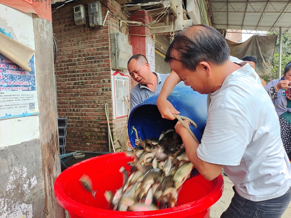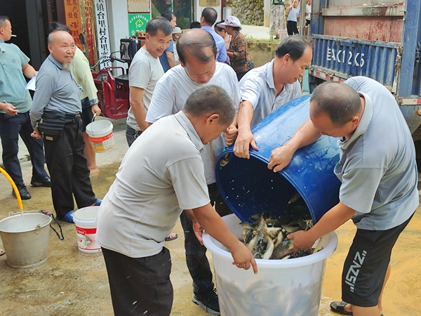 發(fā)放現(xiàn)場(chǎng),工作人員一邊稱重,一邊往群眾帶來的桶里放魚,場(chǎng)面十分熱鬧,農(nóng)戶們臉上洋溢著喜悅的笑容。