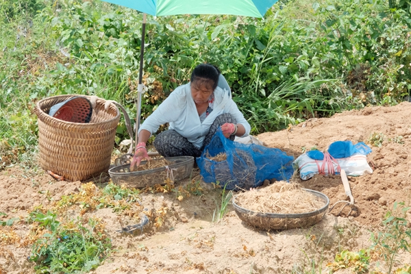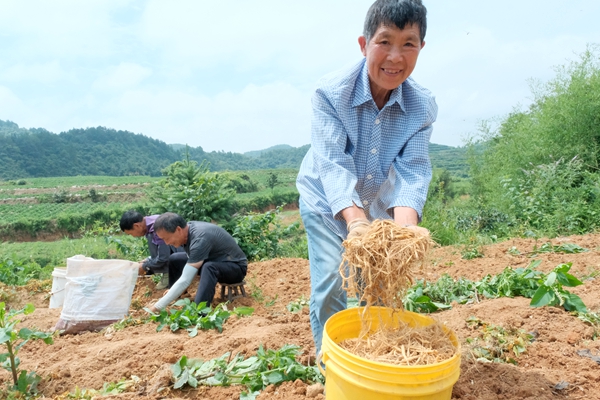 沿著田埂走去,泥土的清香混著藥材甘洌撲面而來(lái)。50多名村民散布其間,或蹲或坐,小鋤頭上下翻飛,一簇簇金黃飽滿(mǎn)、肥碩有人的太子參“嘩啦啦”躍出地面,像撒了一地的碎金。抖土、分揀、碼筐,動(dòng)作一氣呵成,竹筐很快堆成小山。