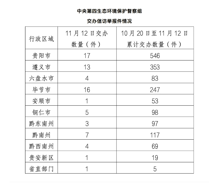 11月12日9時,中央第四生態(tài)環(huán)境保護督察組向貴州移交第二十四批次(11月11日8時至20時)信訪事項共72件,其中群眾來電58件、來信14件,重點信訪事項4件。投訴比較集中的主要是水污染問題,共28個;涉及大氣、噪音、土壤、生態(tài)和其他環(huán)境污染問題分別為27個、16個、14個、18個、4個。