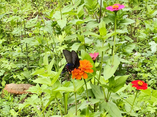 仲夏的黔東南,凱里至凱棠公路棉花村段已成流動花海。1.8公里通寨公路兩側(cè),百日草與硫華菊交織怒放,宛如一條絢麗的彩帶,從寨口輕盈延伸至村委活動室。蝶舞蜂飛間,村婦簪花鬢,孩童逐蝶忙,笑語伴著花香在林間蕩漾——一條尋常村道,蝶變?yōu)榇迕裥募馍系摹胺曳贾贰薄?/p>
