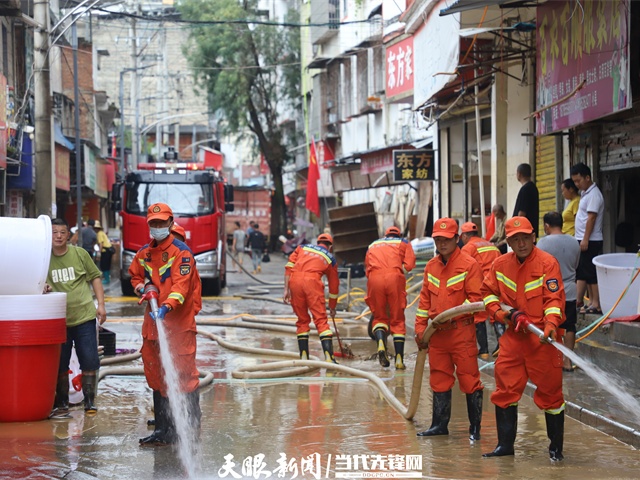 30℃高溫下,張井華與戰(zhàn)友用雙手將泡爛的家具、損毀的電器、沉重的貨架殘骸一件件抬出廢墟,再架起高壓水槍,沖洗干凈店面與街道。