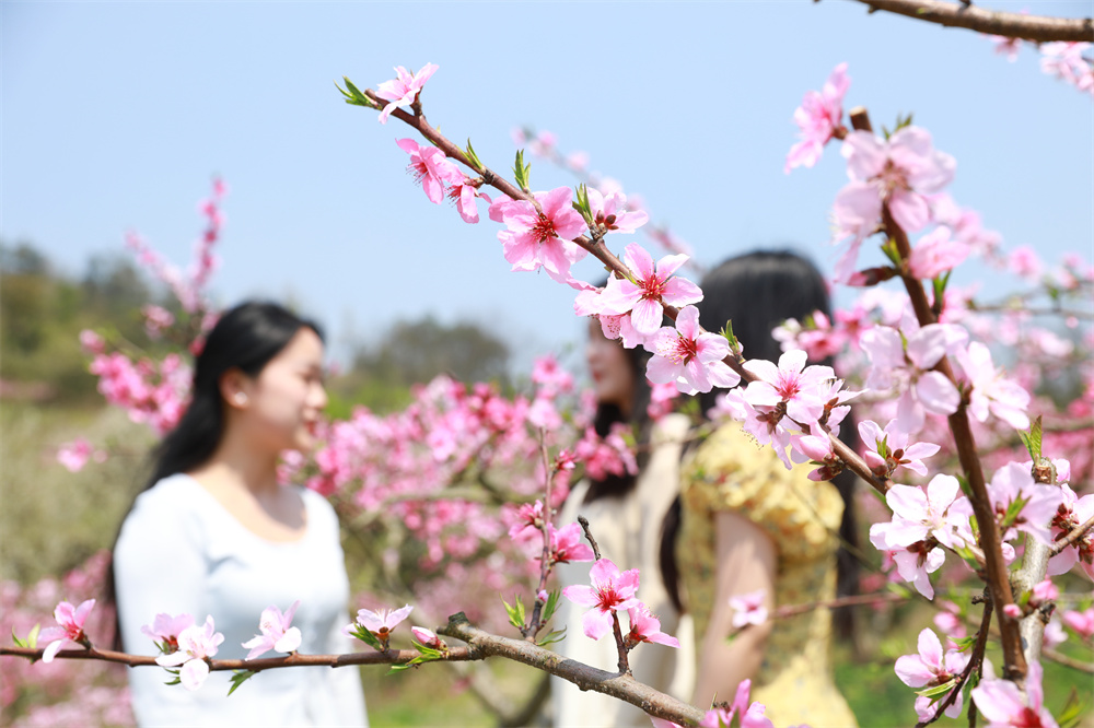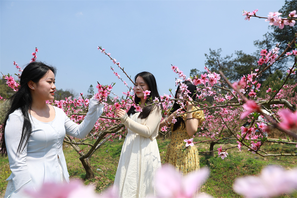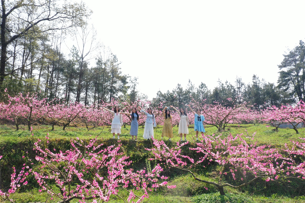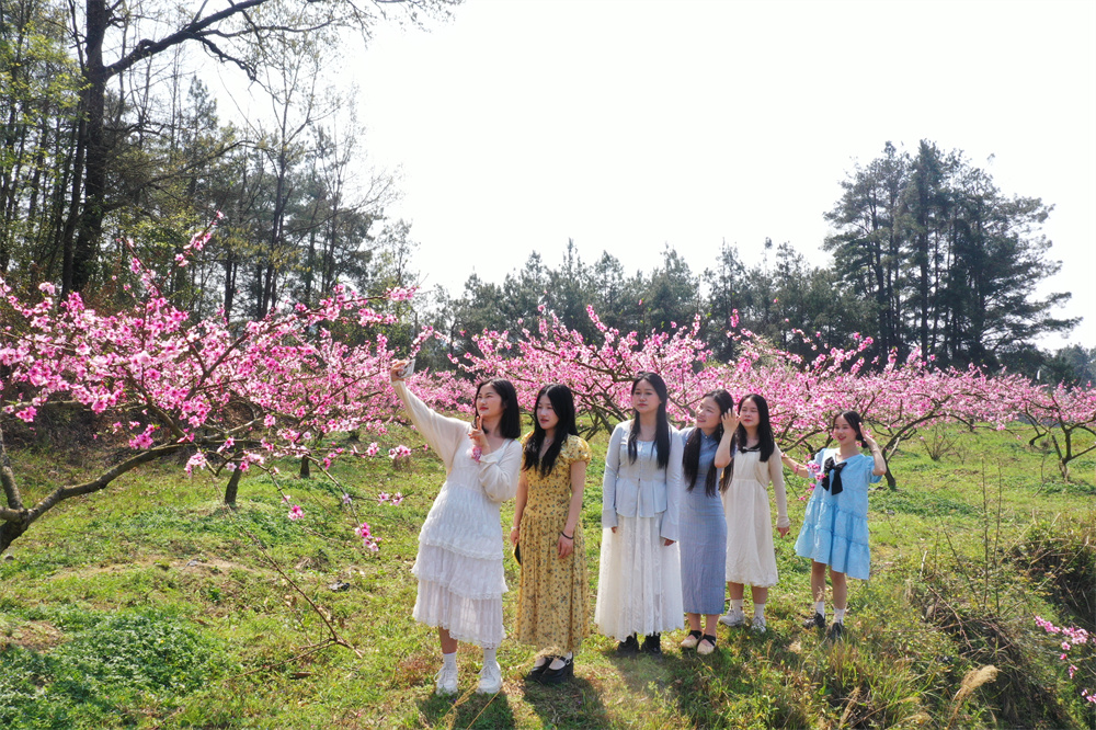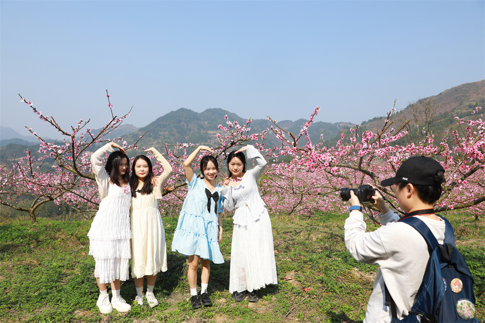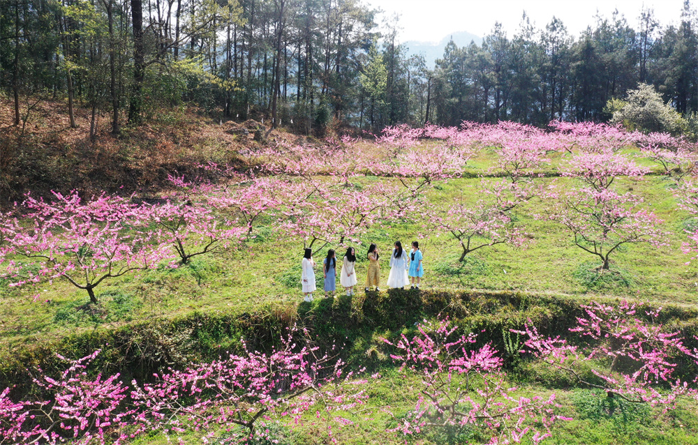 千樹萬樹粉云墜,香雪成陣撲人衣。走進(jìn)嫵陽紅桃示范基地,蜿蜒的山路兩側(cè),桃花綴滿枝頭,微風(fēng)拂過,花瓣紛揚(yáng)如雨。游客們身著旗袍、少數(shù)民族服裝穿行在桃花林里,拍照、賞花、嬉鬧,勾勒出一幅生動的春日畫卷。