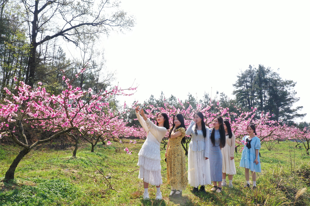 “我們幾個(gè)小姐妹約著一起來看桃花、拍照片,我覺得這邊的空氣很好,今天的陽光也充足,花拍出來非常好看?!庇慰妄堈m說。