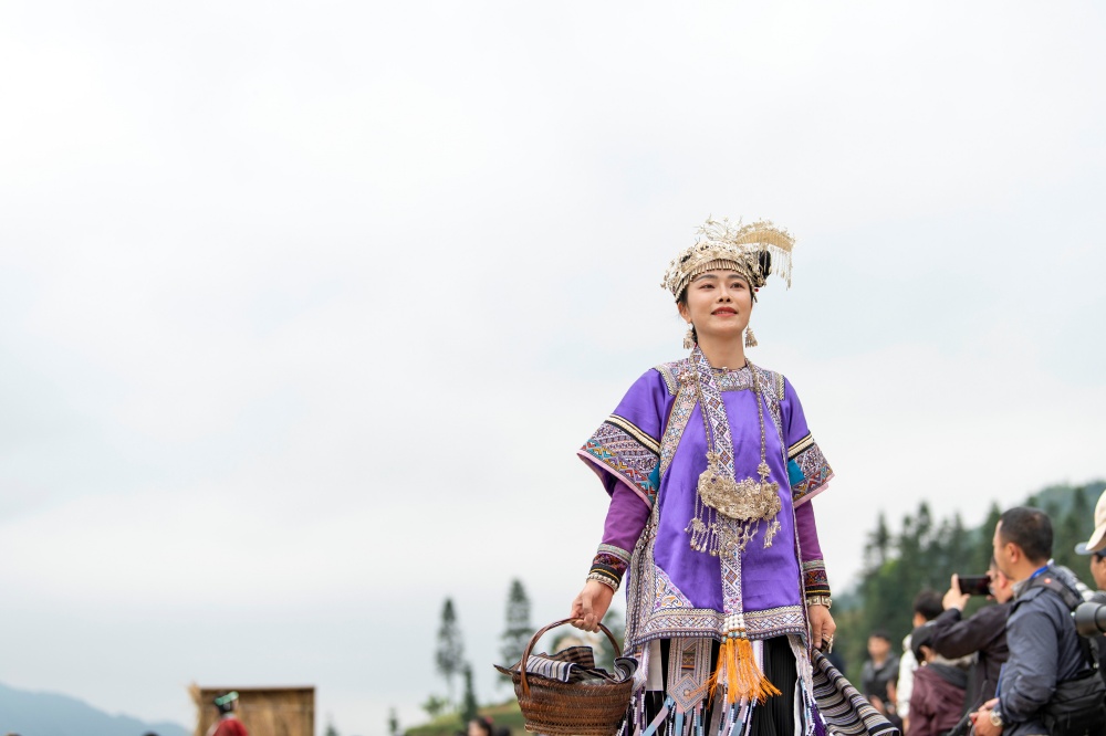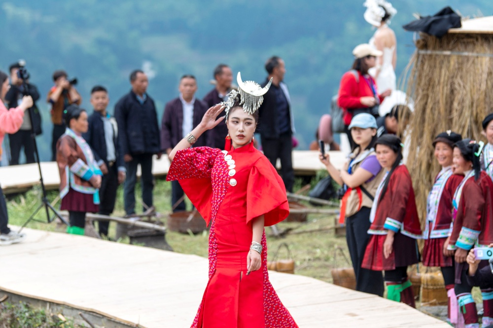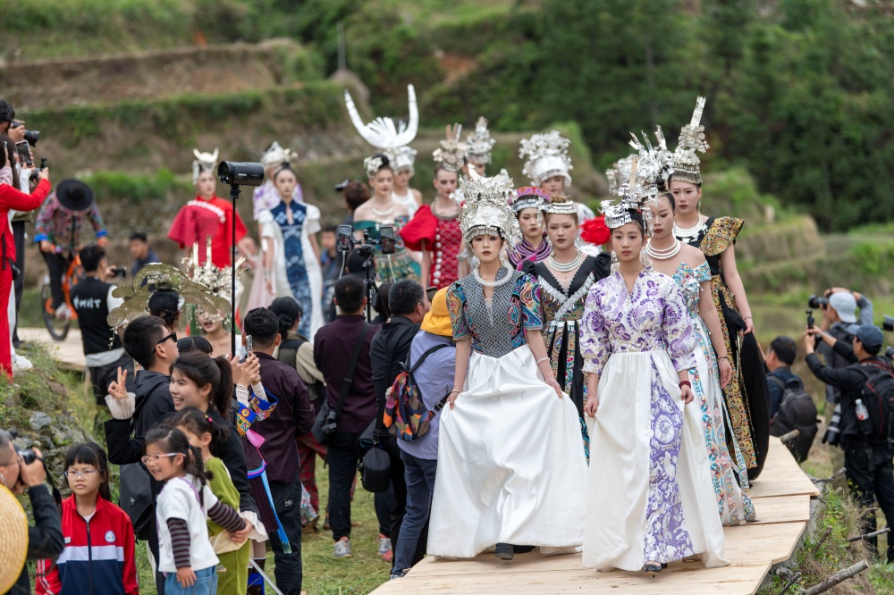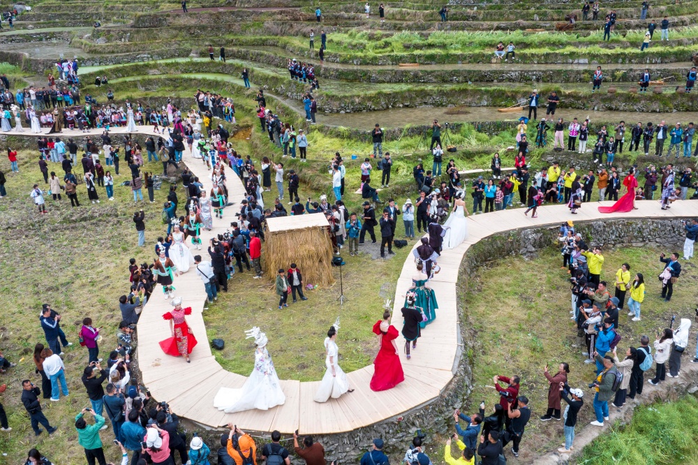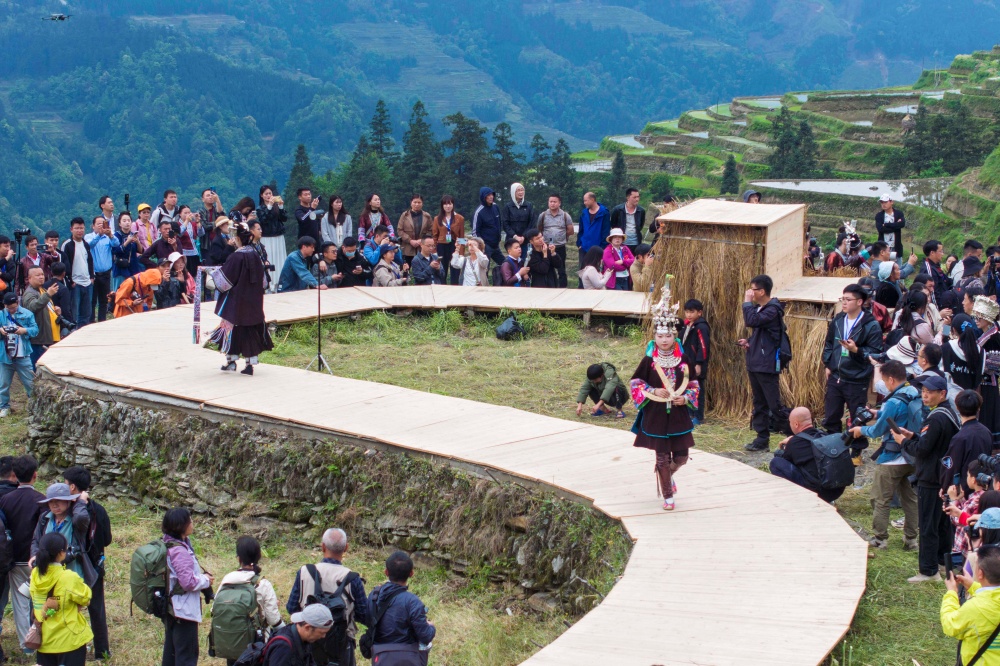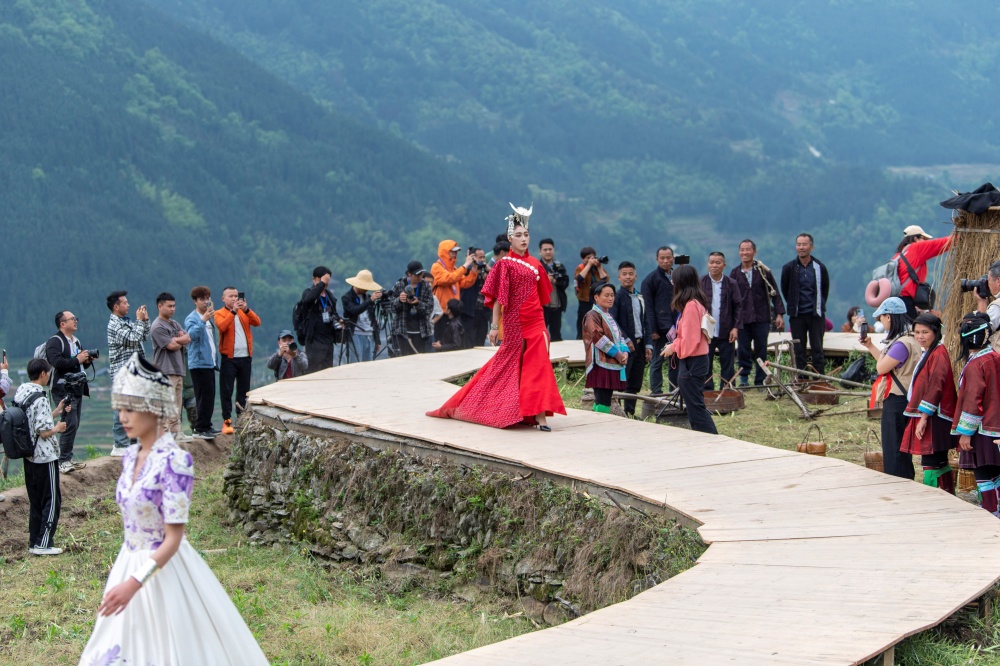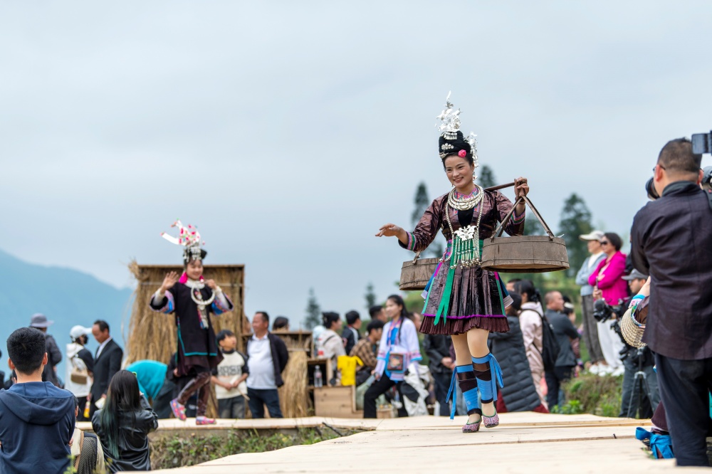 4月26日,村民在貴州省從江縣加榜梯田上參加梯田走秀活動(dòng)。