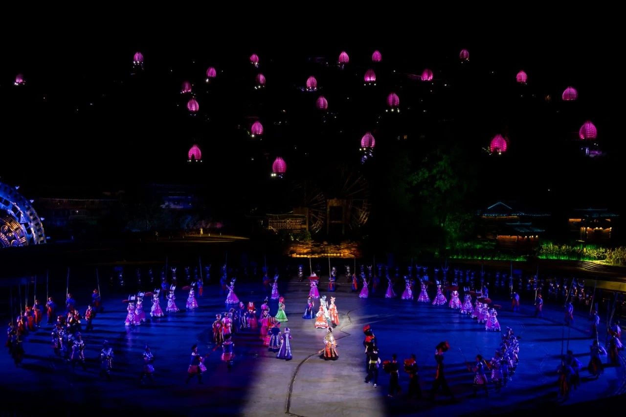 夜幕降臨,在雷山縣大塘景區(qū)《仰歐桑》劇場,隨著劇情推進(jìn),50臺無人機(jī)在編程操控下有序升空,于夜空中幻化出蝴蝶媽媽、蝗蟲等形象。光影流轉(zhuǎn)間,無人機(jī)組成的圖案與舞臺上的歌舞表演相互輝映,讓觀眾沉浸在苗族文化氛圍之中?!昂苷鸷?無人機(jī)突然變成蝗蟲的樣子,和舞臺上的劇情表演配合得天衣無縫,我還是第一次在現(xiàn)場看到這么精彩的演出!”來自江西的游客莫茂思激動地?fù)]舞著手機(jī),向記者展示她拍攝的無人機(jī)表演畫面,“這些光影圖案讓我感覺自己好像走進(jìn)了苗族的神話故事里。”