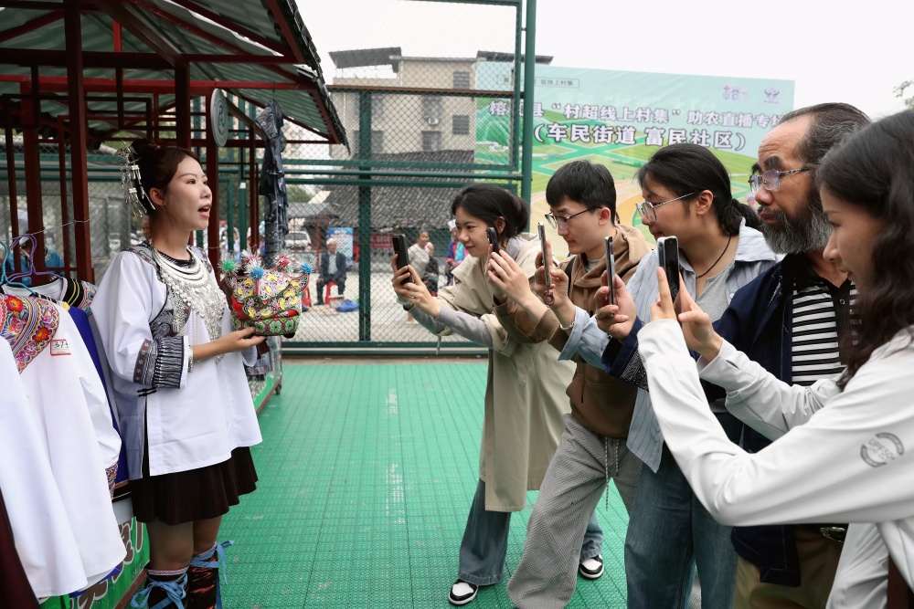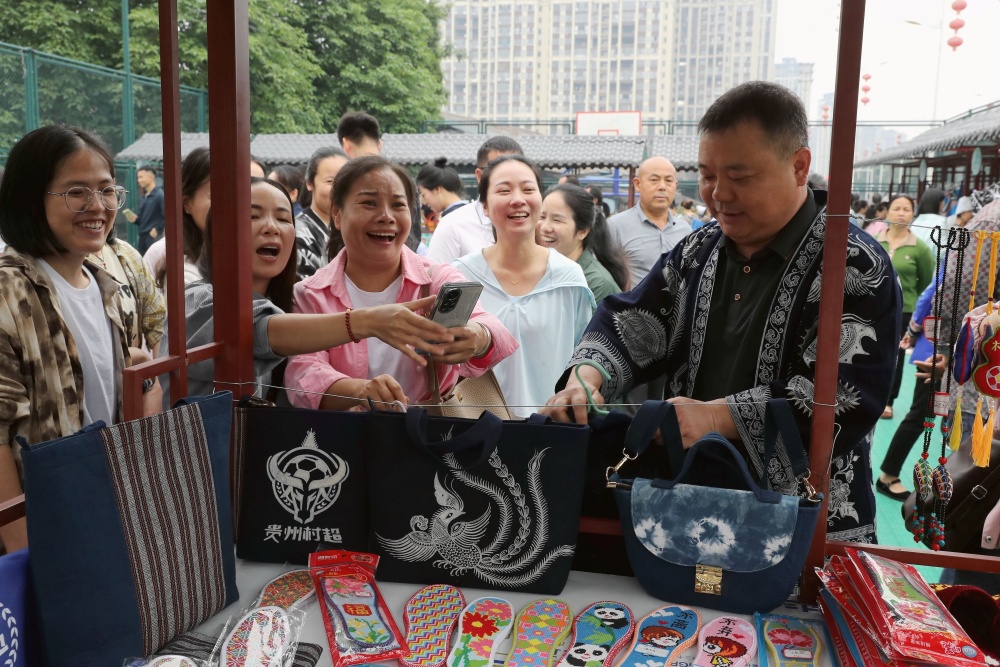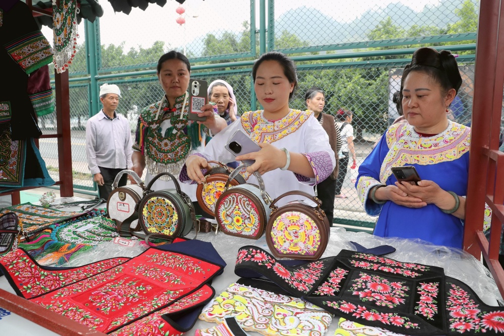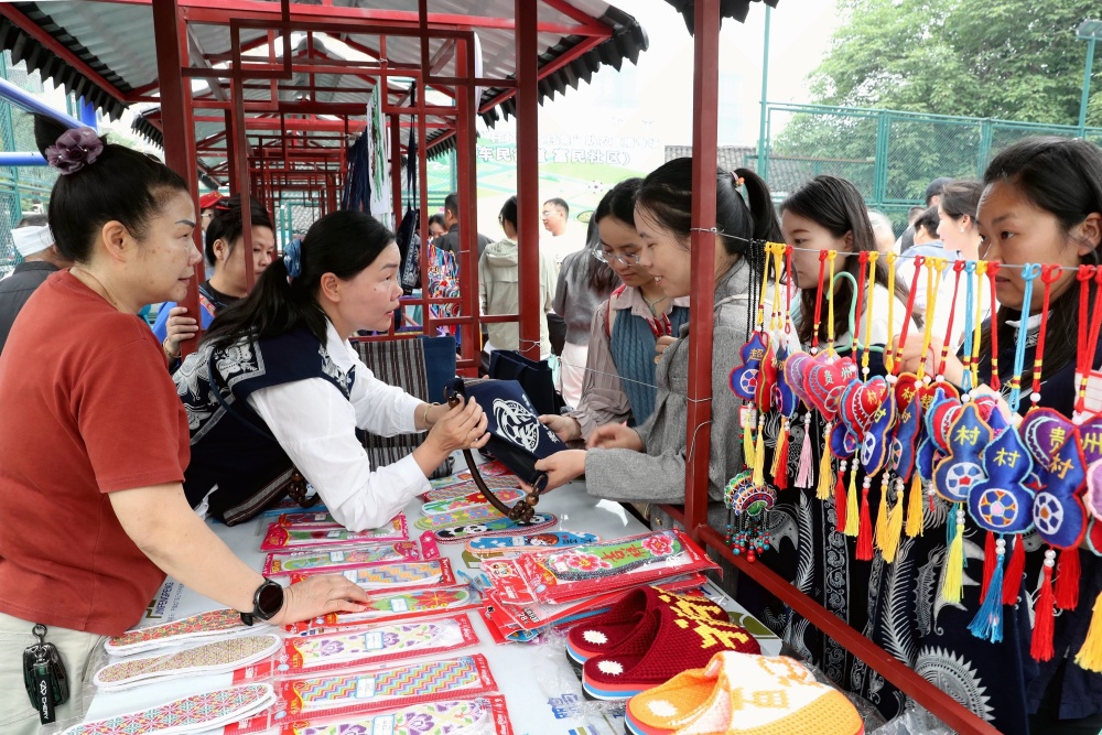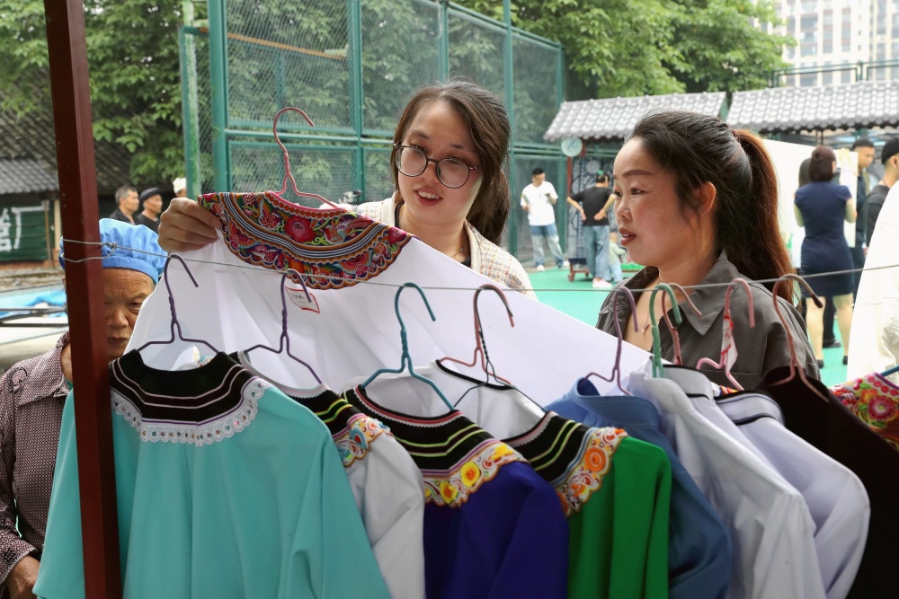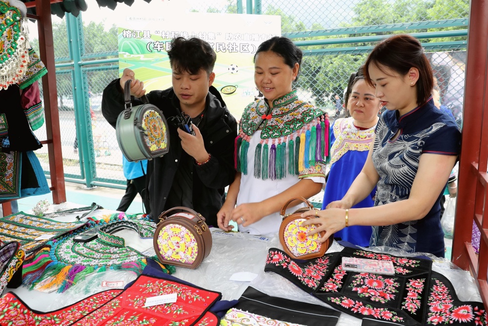 5月14日,在貴州省黔東南苗族侗族自治州榕江縣車民街道富民社區(qū),市民在展播位上擺放民族手工藝產(chǎn)品。