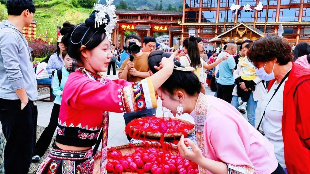 劇場外的配套服務(wù)也同樣精心設(shè)計:游客可觀賞苗族蘆笙舞、掌坳銅鼓舞、短裙苗族文化歌舞的非遺展演,可體驗“十二道攔門酒”“高山流水”迎賓禮,可參與蠟染、銀飾鍛造等非遺手作;通過“一票通”全域聯(lián)動,可憑觀演票免費(fèi)游覽西江千戶苗寨與郎德苗寨。