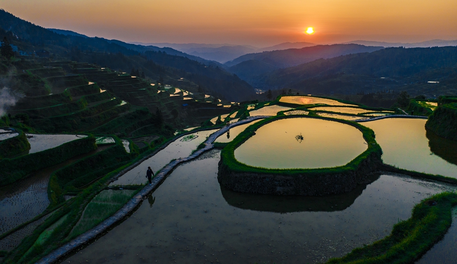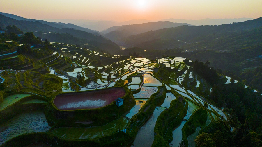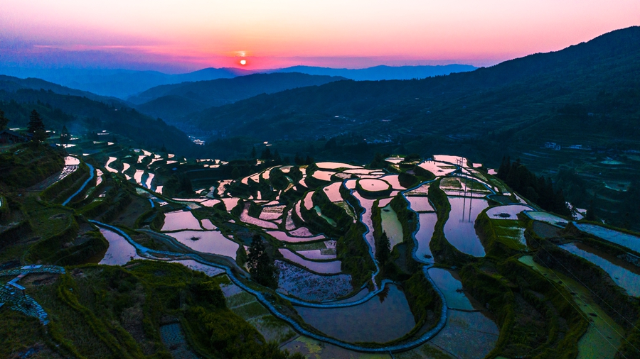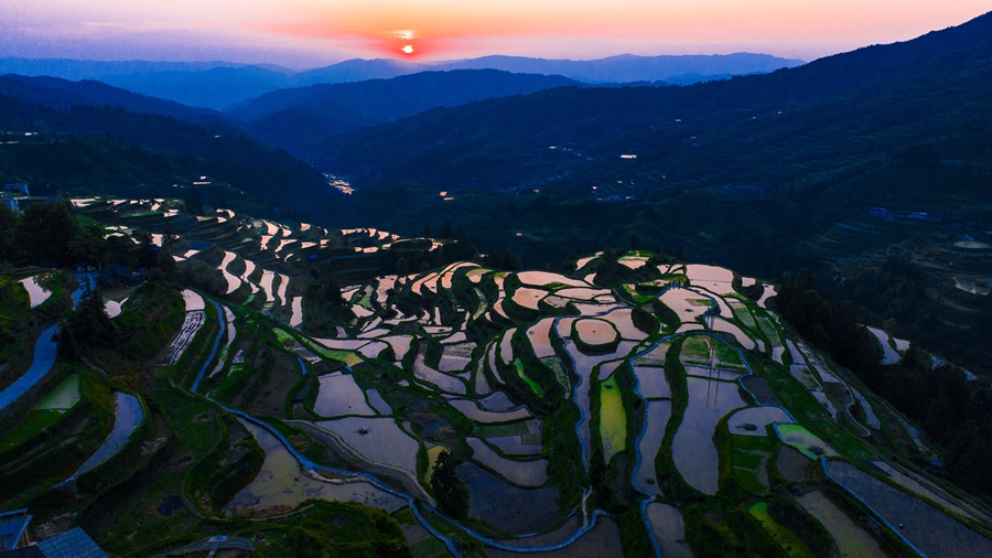 初夏,位于貴州省黎平縣肇興鎮(zhèn)的廈格梯田注水耙種,耘耙過(guò)后的“新田”猶如銀月環(huán)繞青山,勾勒著天地間最美的曲線。日落時(shí)分,夕陽(yáng)灑在水面上,田間漸變出不同顏色的光,紅、藍(lán)、紫、綠相間,好似多彩的調(diào)色盤,美不勝收。