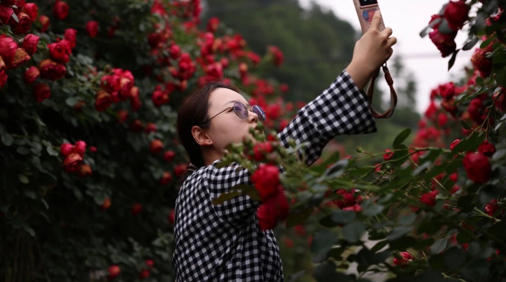 游客們穿梭于花海之間,享受著花的贈禮,有的用鏡頭捕捉月季的靈動瞬間,有的拍照打卡留念,攜三五好友或家人孩子在綠水與花海間感受大自然的美好。