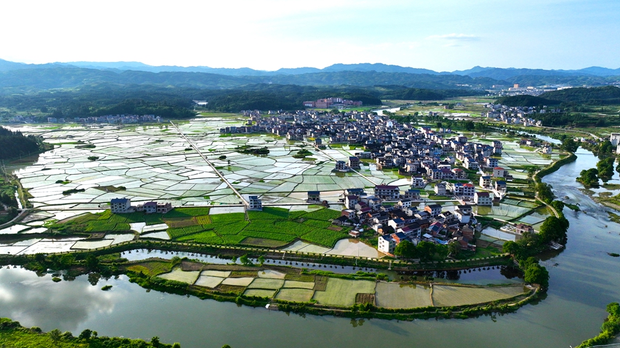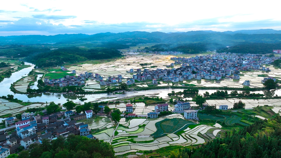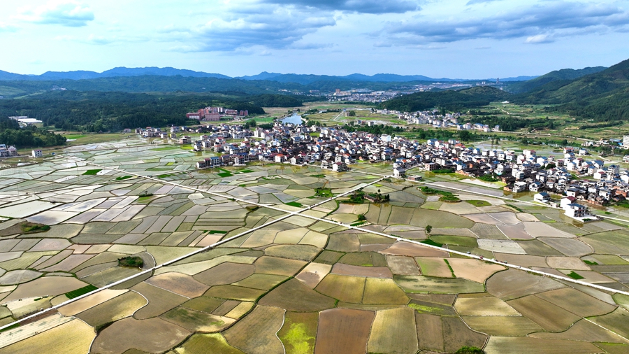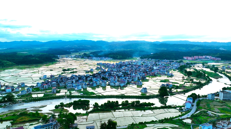 航拍下的敦寨鎮(zhèn)農(nóng)業(yè)大壩內(nèi)阡陌縱橫,平整如鏡的水田倒映著藍天白云,構(gòu)成一幅絕美的田園風光圖。田間地頭,農(nóng)民們動作嫻熟、專注地彎腰插秧,一株株秧苗承載著豐收的期許,也昭示著鄉(xiāng)村振興的美好前景。