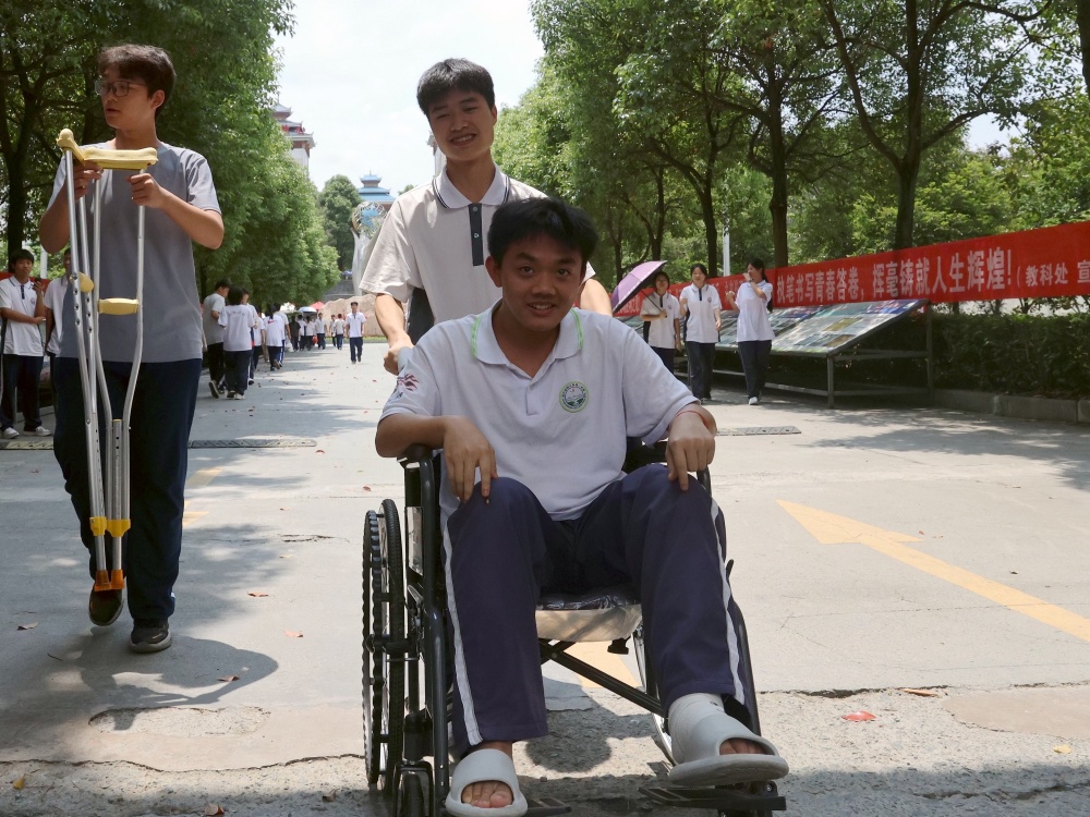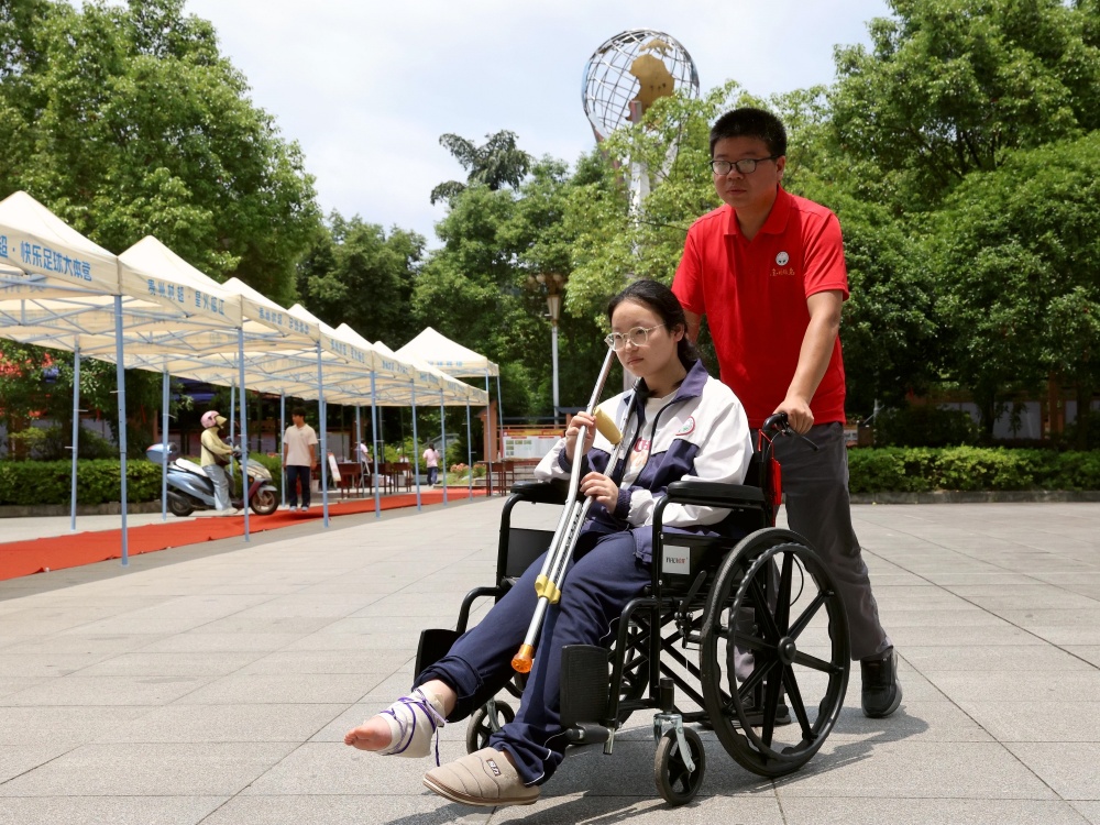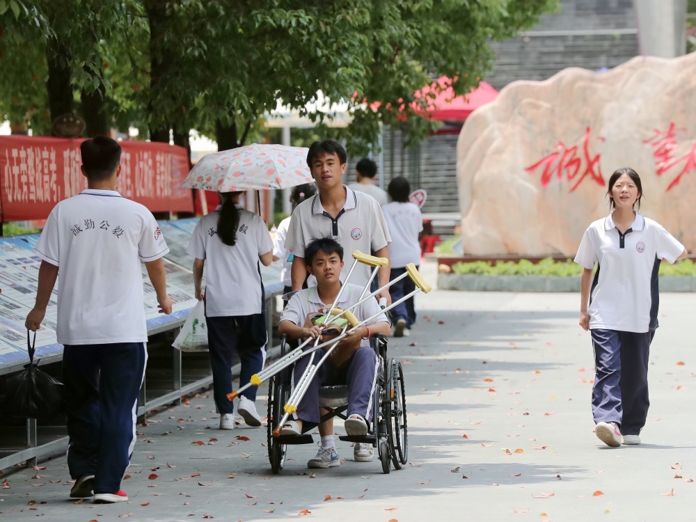 6月7日,在貴州省黔東南苗族侗族自治州榕江縣第一中學(xué)考點(diǎn)上午考試結(jié)束后,老師將一名腳部受傷的考生從考場推入宿舍。