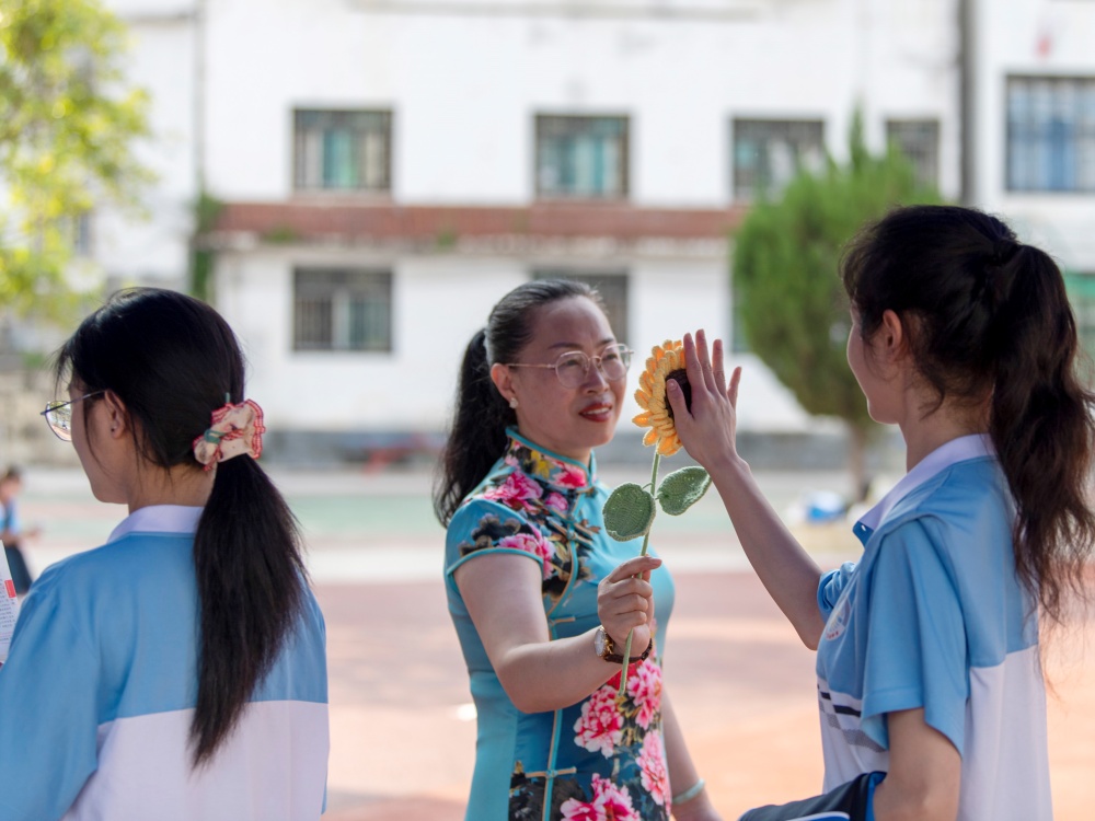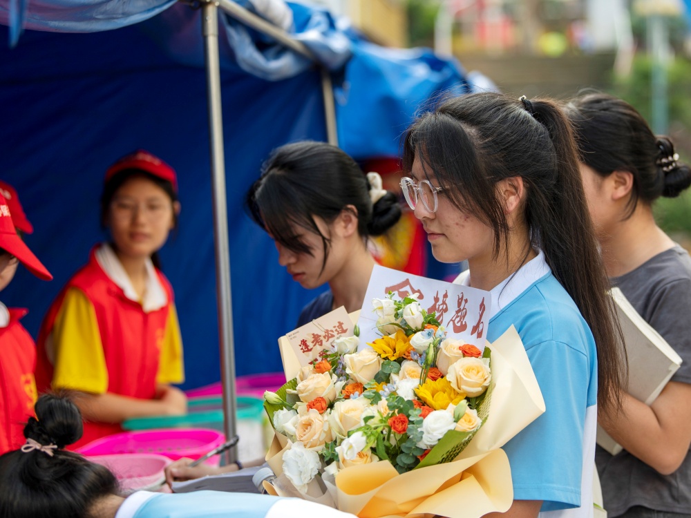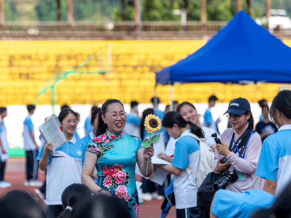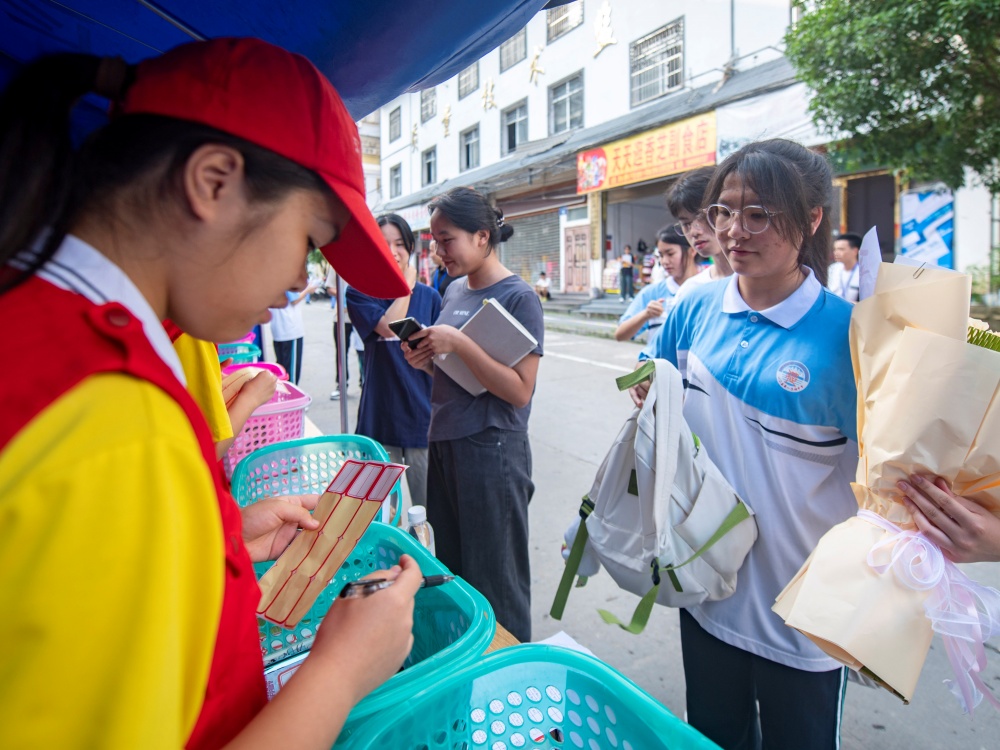 6月7日,在貴州省從江縣第一民族中學(xué)考點(diǎn),送考老師帶著“葵花”為考生加油。當(dāng)日,2025年全國高考拉開帷幕。