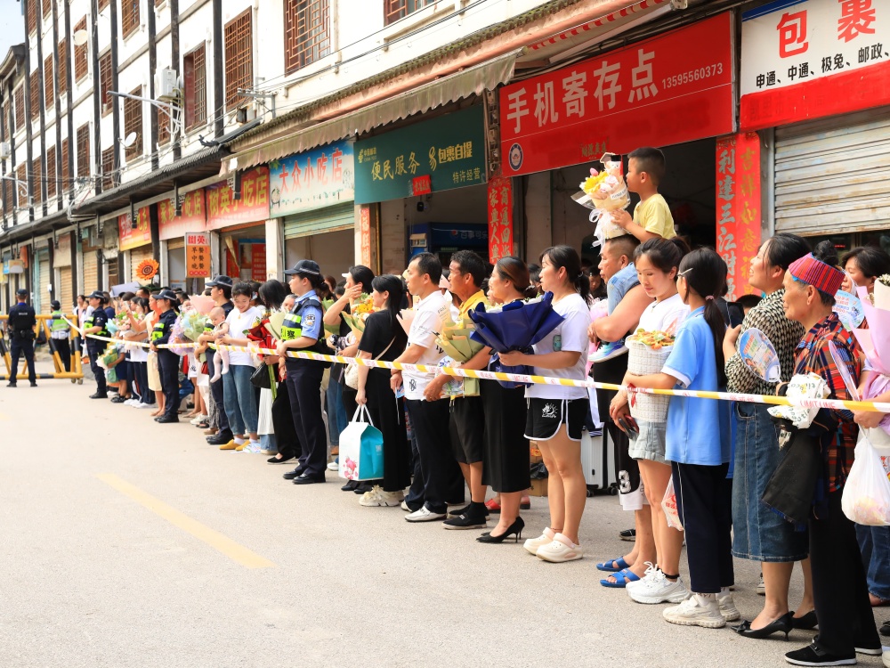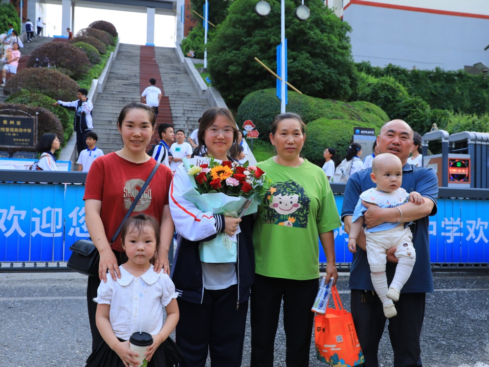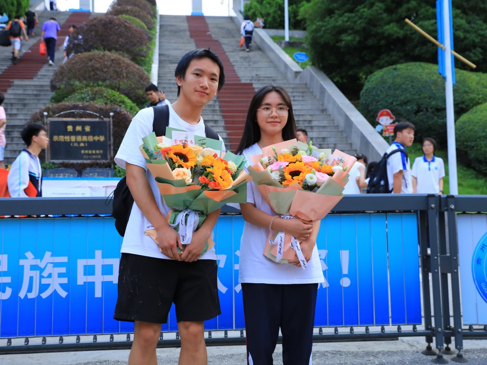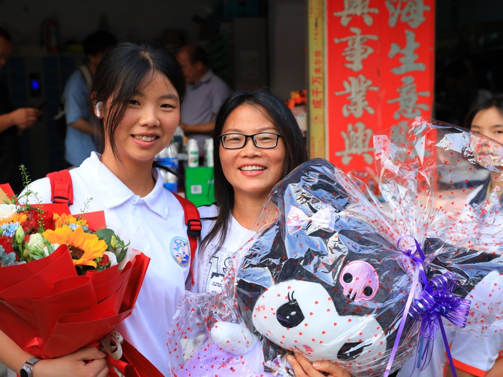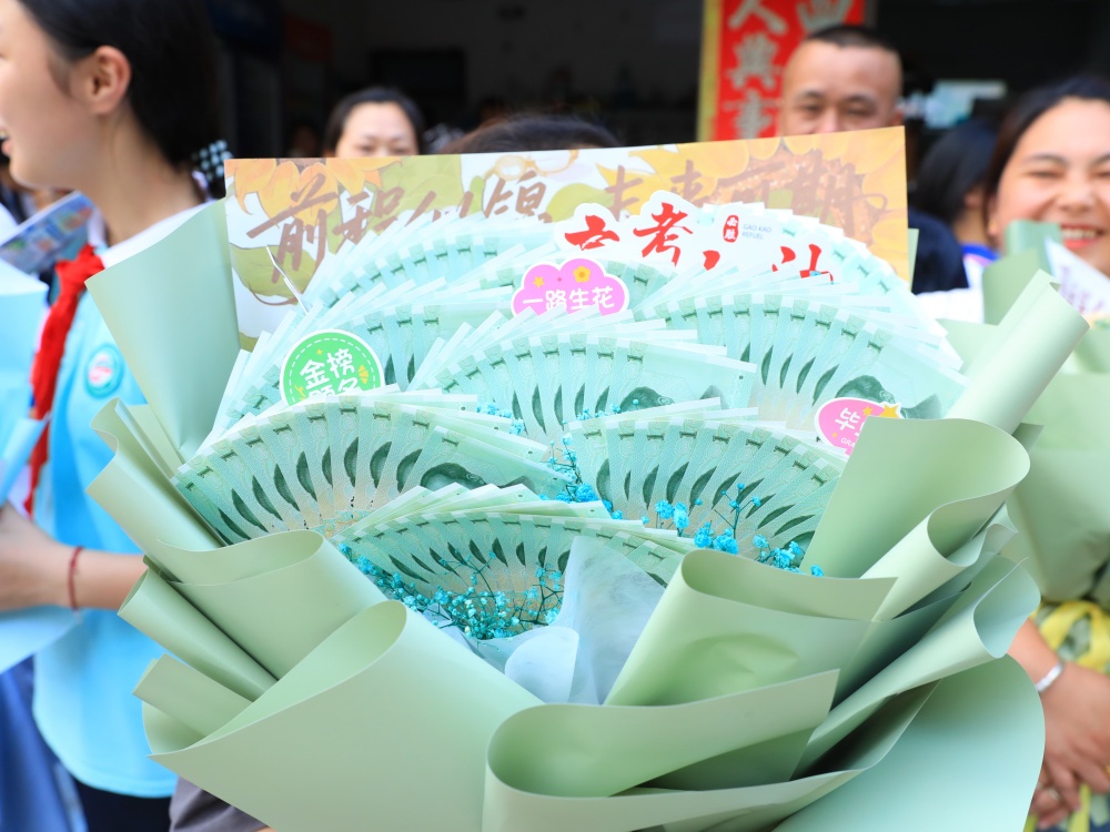 有的家長身著旗袍,取“旗開得勝”之意;有的家長身穿印有“祝兒子金榜題名”字樣的紅色短袖,象征著吉祥與好運;還有的家長手拿向日葵,寓意“一舉奪魁”。此外,現(xiàn)場還有各式各樣的花束,每一束都承載著對孩子們金榜題名、前程似錦的美好祝福。