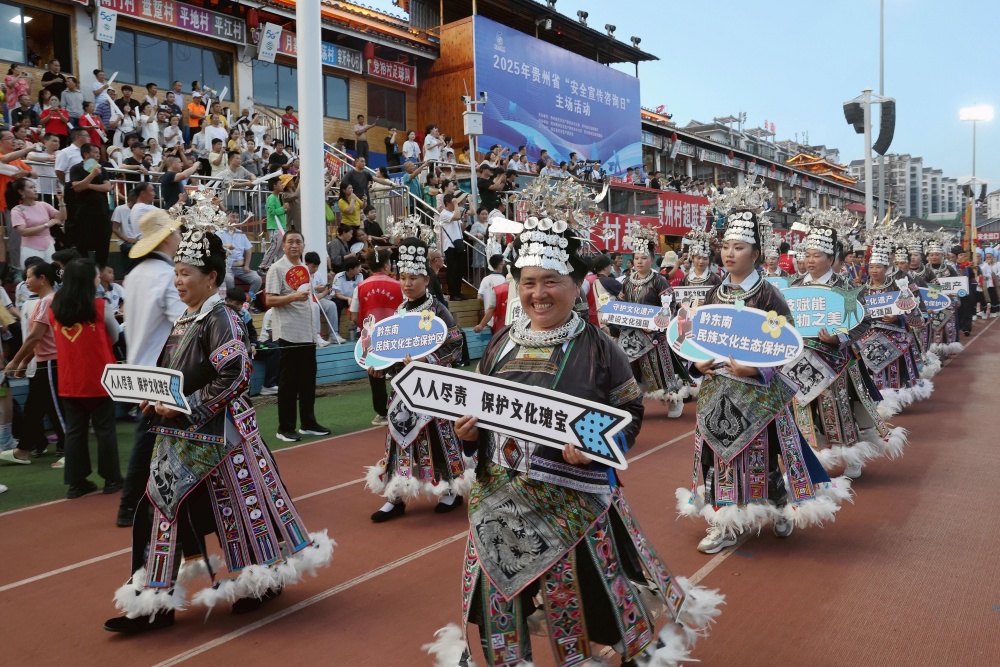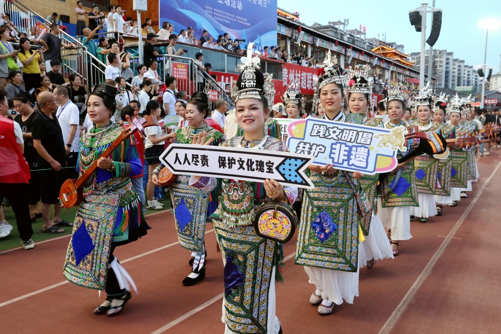 6月14日,貴州省黔東南苗族侗族自治州榕江縣在城北新區(qū)“村超”足球場開展“文化和自然遺產(chǎn)日”非遺主題宣傳展示活動,來自榕江縣苗族、侗族、水族等群眾以及非物質(zhì)文化遺產(chǎn)傳承人為觀眾和球迷展示民族服飾、民族傳統(tǒng)建筑、民族音樂、民族傳統(tǒng)美食等,讓人們在觀看足球比賽的同時感受民族傳統(tǒng)文化魅力,樂享非遺文化盛宴,激發(fā)人們保護和傳承非物質(zhì)遺文化遺產(chǎn)的熱情,增強全社會對文化遺產(chǎn)保護意識。