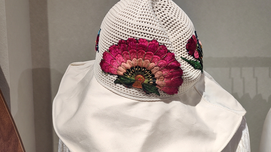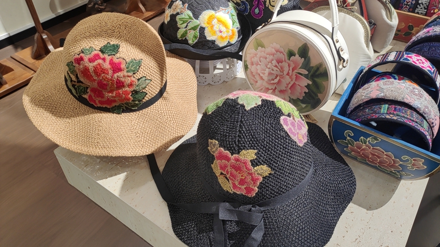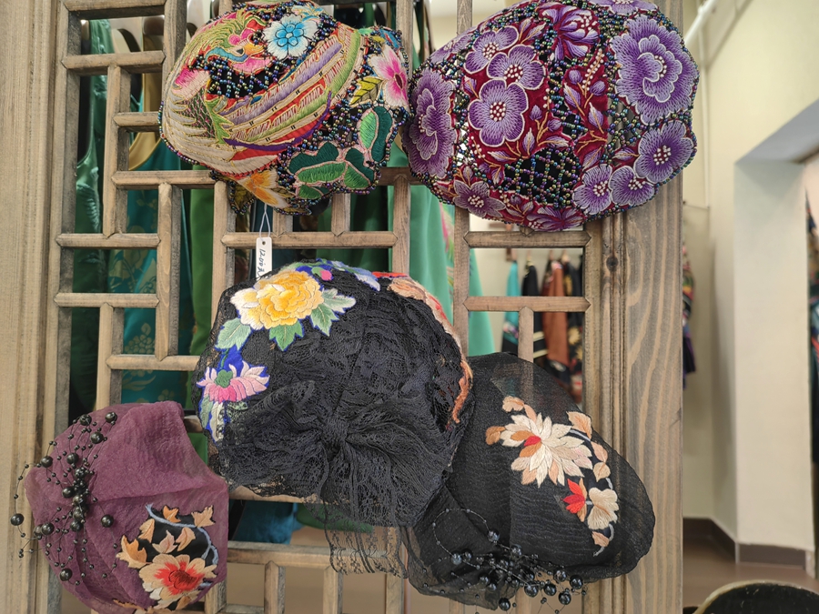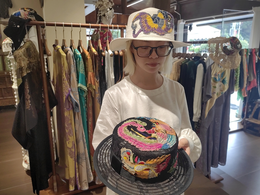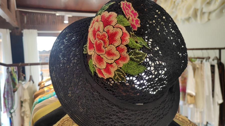 苗繡元素帽子更是集市的一大亮點(diǎn)。阿朵苗繡店家介紹,他們開發(fā)這類帽子已有兩年時(shí)間,產(chǎn)品深受市場(chǎng)歡迎,遠(yuǎn)銷北上廣深圳等地。這些帽子的制作工藝復(fù)雜而精細(xì),繡娘需先在布料上繡出鳳凰或者花朵等各式精美花色與圖案,再精心剪下寓意吉祥的圖騰,最后一針一線縫制到帽子上。從大檐帽、貝雷帽到草帽,款式豐富多樣,每頂都獨(dú)具匠心,將傳統(tǒng)苗繡文化與現(xiàn)代時(shí)尚完美融合。