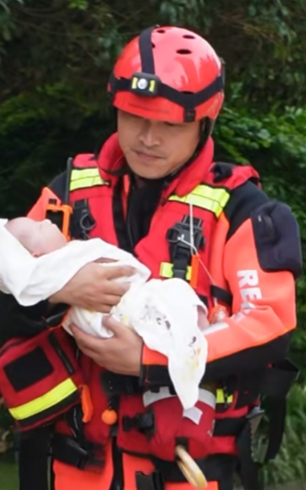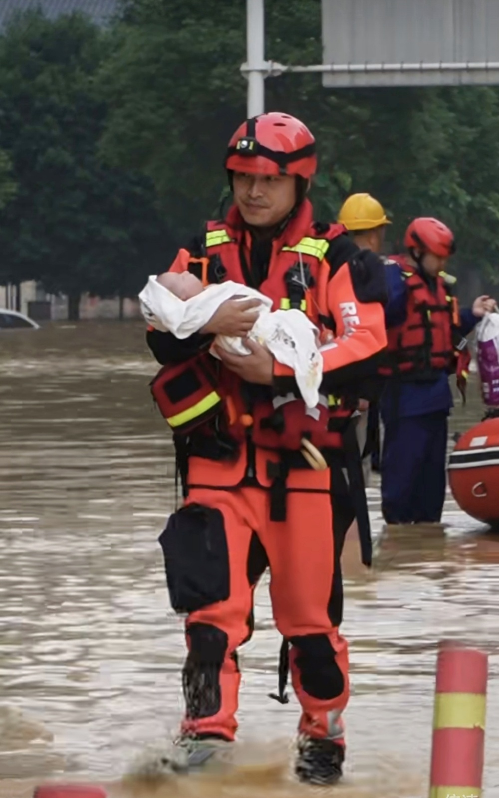 6月24日下午,救援行動(dòng)正緊鑼密鼓地推進(jìn)。劉元?dú)g帶領(lǐng)的營(yíng)救小組突然接到調(diào)度指令:月子中心有一名剛分娩的產(chǎn)婦和新生兒亟待轉(zhuǎn)移。情況緊急,他立刻帶領(lǐng)隊(duì)員駕駛沖鋒舟火速趕往現(xiàn)場(chǎng)。抵達(dá)后,面對(duì)襁褓中脆弱的嬰兒,劉元?dú)g伸出堅(jiān)實(shí)卻又格外輕柔的臂膀,小心翼翼地將孩子接過(guò)。轉(zhuǎn)移途中,他一邊穩(wěn)穩(wěn)護(hù)著嬰兒避開(kāi)顛簸,一邊輕輕拍著孩子的后背低聲安撫,直至抵達(dá)安全區(qū)域,嬰兒依然安心酣睡著,絲毫未被外界的紛亂驚擾。