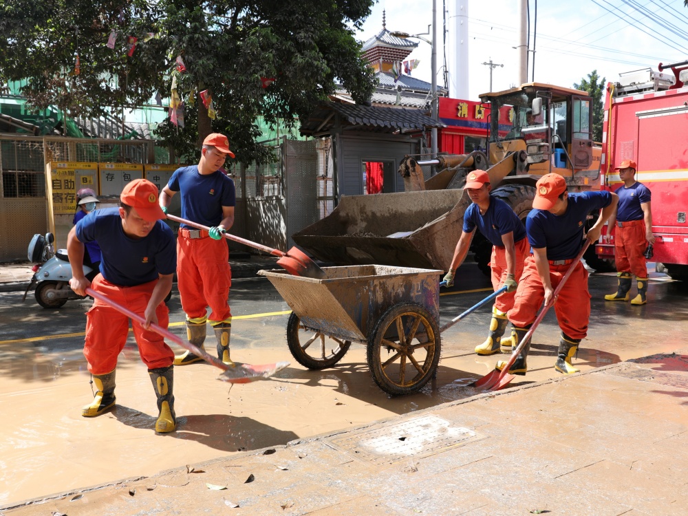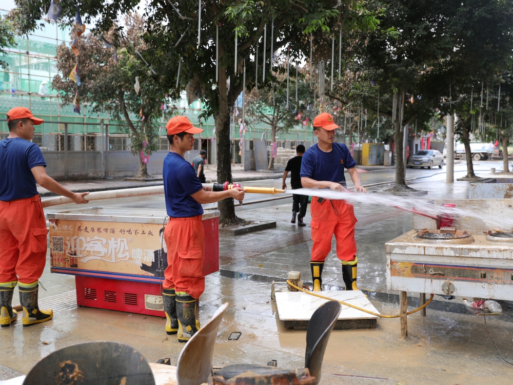 球場(chǎng)的淤泥剛清理完畢,劉元?dú)g便帶領(lǐng)隊(duì)友們馬不停蹄地轉(zhuǎn)戰(zhàn)下一個(gè)“戰(zhàn)場(chǎng)”——幫助清理球場(chǎng)外圍的商鋪。傾倒的廣告牌被合力扶正,散落的垃圾被一一清掃,高壓水槍逐家沖洗著沾滿泥漿的桌椅、廚具和貨柜。