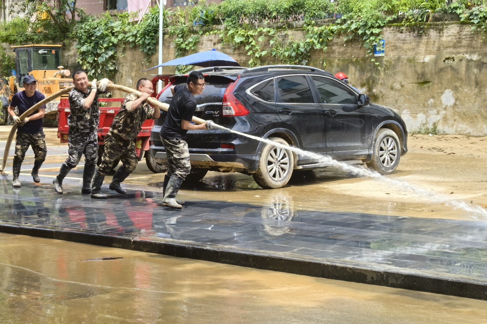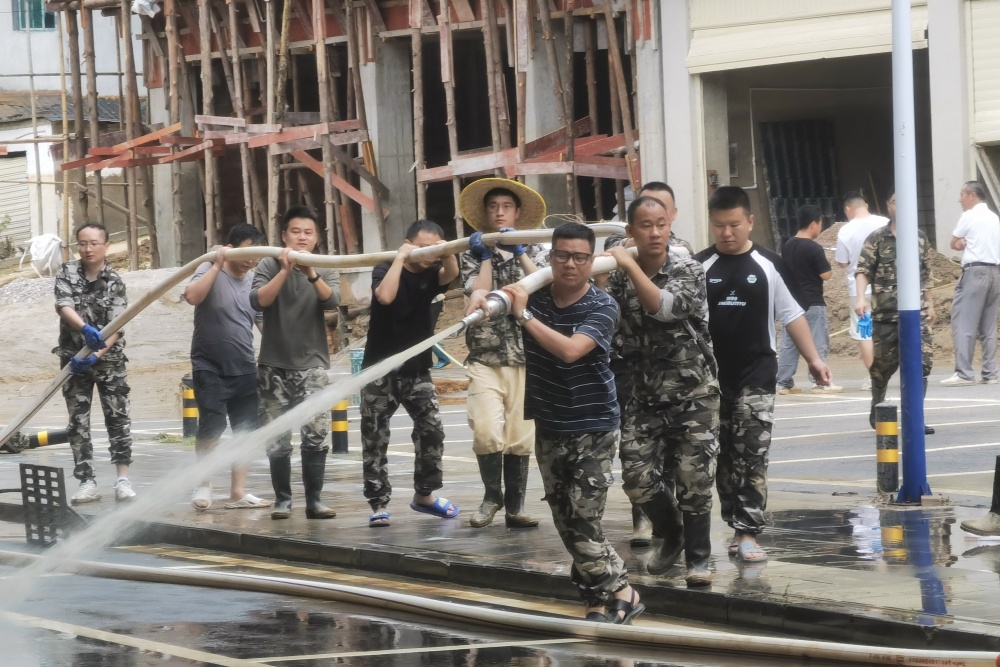 沖洗街道的任務(wù)中,身為隊長的楊秀永始終站在最前列。他緊握高壓水槍槍頭,精準控制水流方向,隊員們肩扛消防管緊隨其后,從街道一端穩(wěn)步推進,確保不留任何衛(wèi)生死角。“大家堅持住!不怕臟累,家園很快就能恢復(fù)!”他的鼓勁聲穿透污濁,成為團隊前進的“強心劑”。