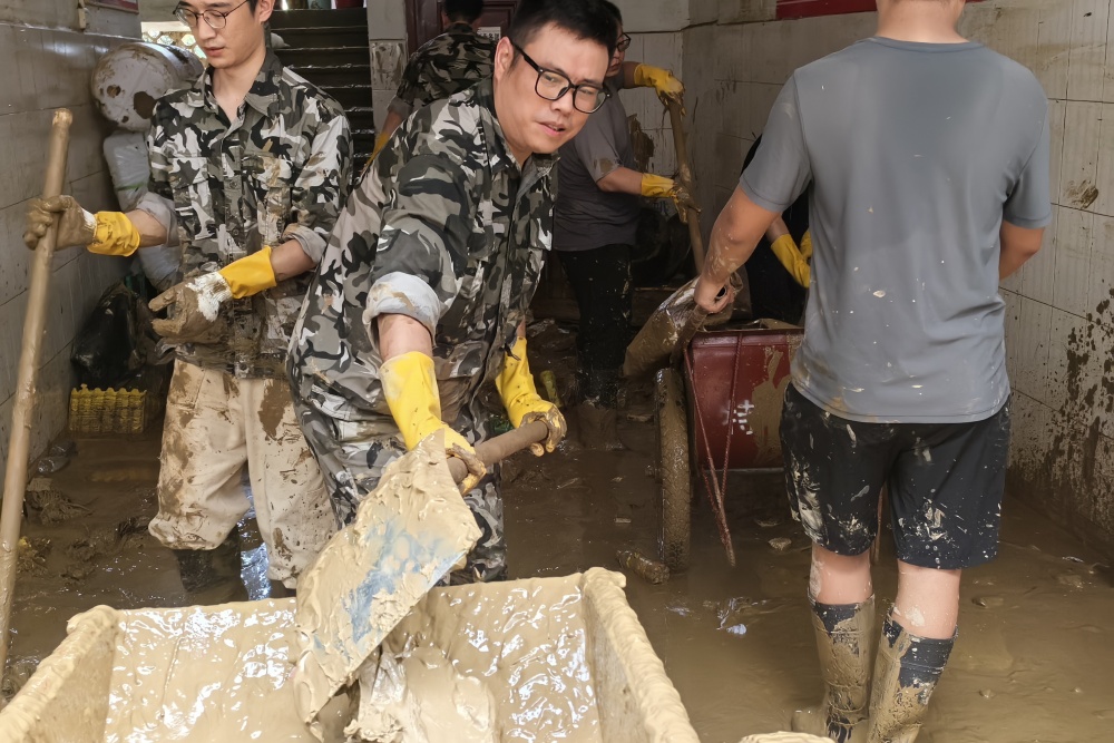 6月25日下午3時,楊秀永帶領(lǐng)8名法院干警組成的青年突擊隊抵達災(zāi)區(qū),旋即投入清淤與重建工作。面對堆積如山的淤泥和刺鼻異味,他緊握鐵鍬,一鍬一鍬重復(fù)著鏟運動作,率先拉開戰(zhàn)斗序幕。