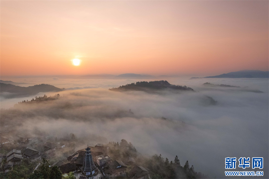 ?7月7日,在貴州省從江縣高增鄉(xiāng)美德侗寨拍攝的云海奇觀(無人機照片)。