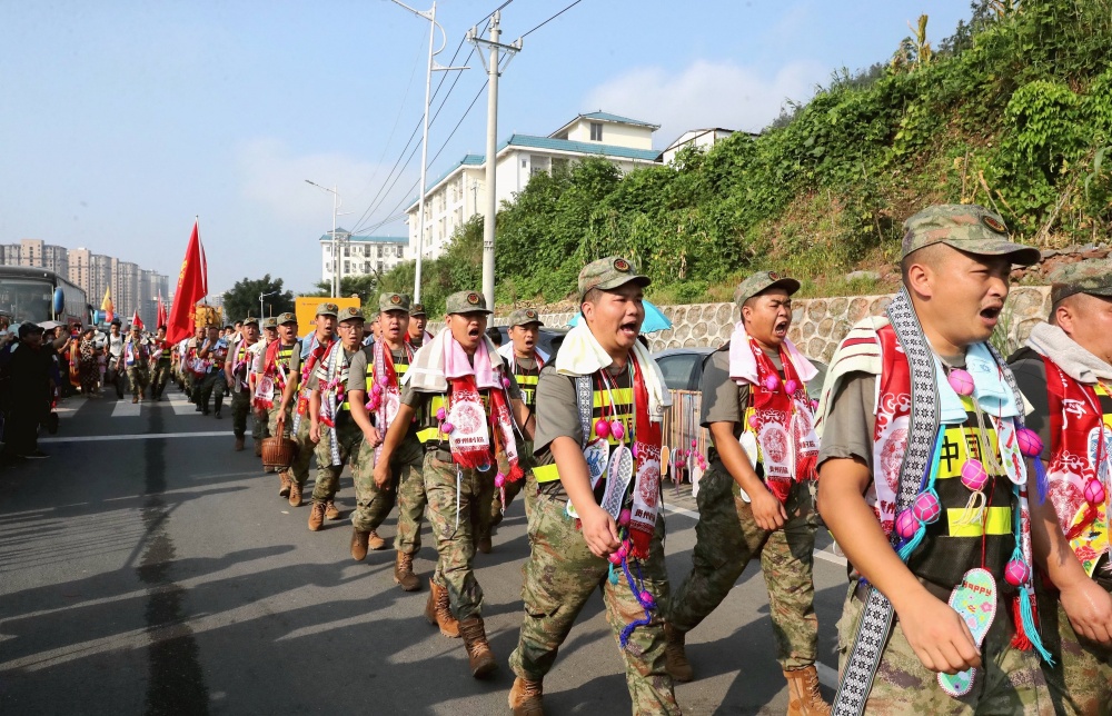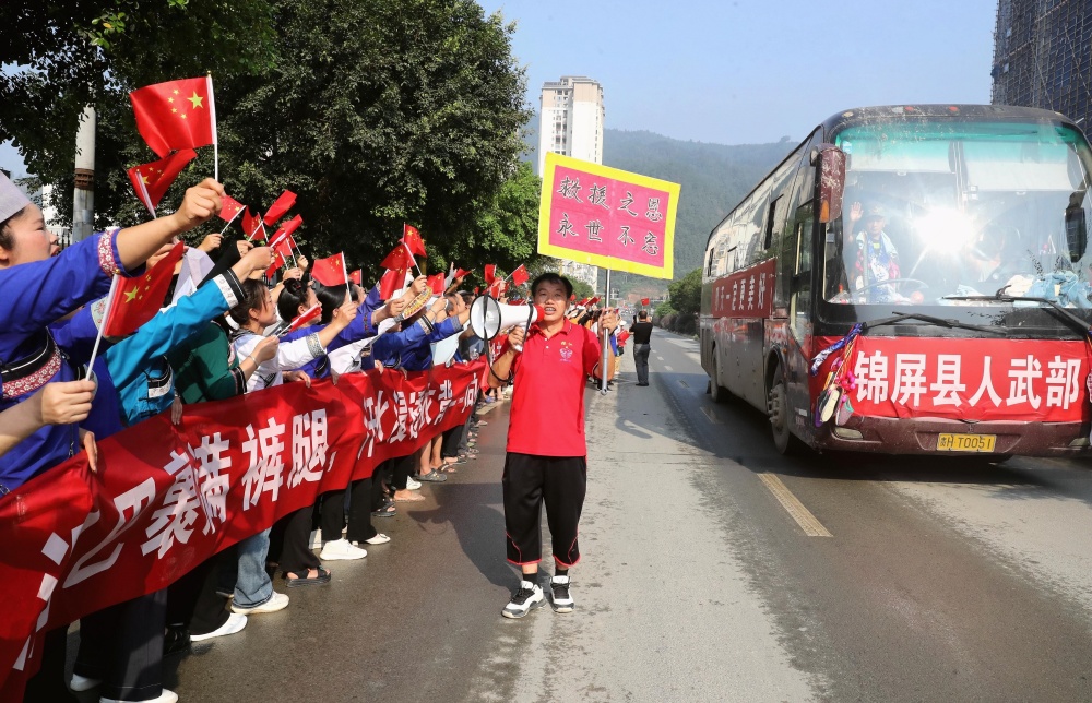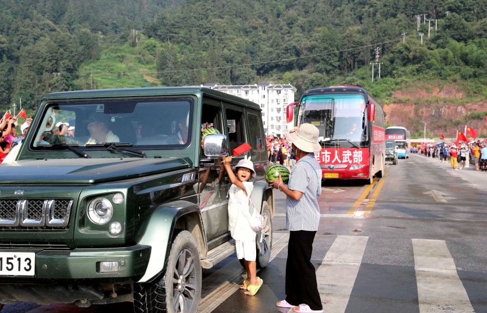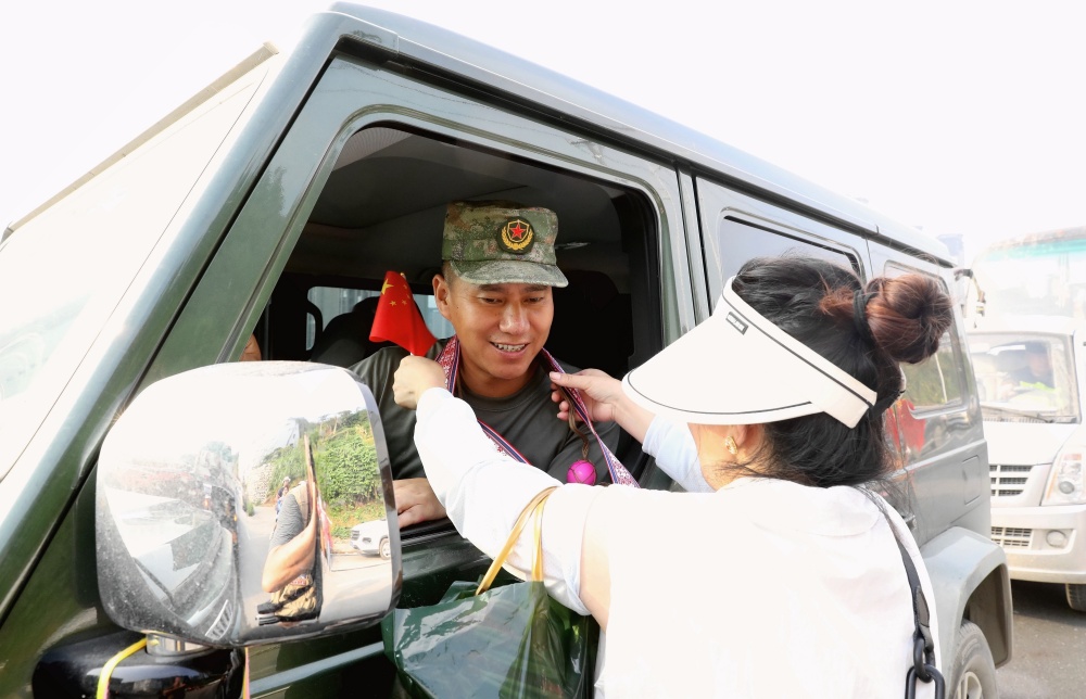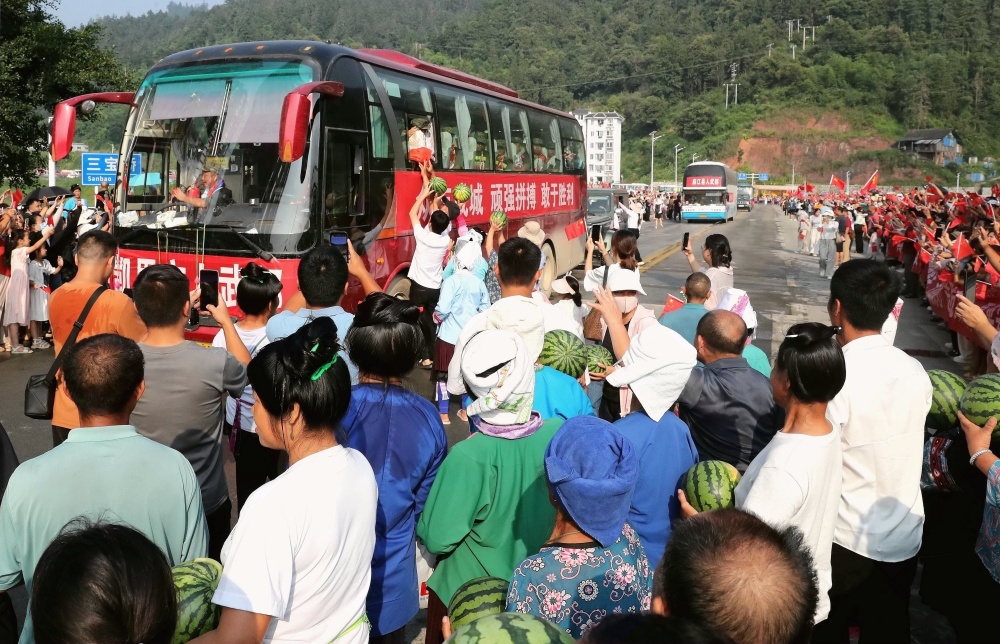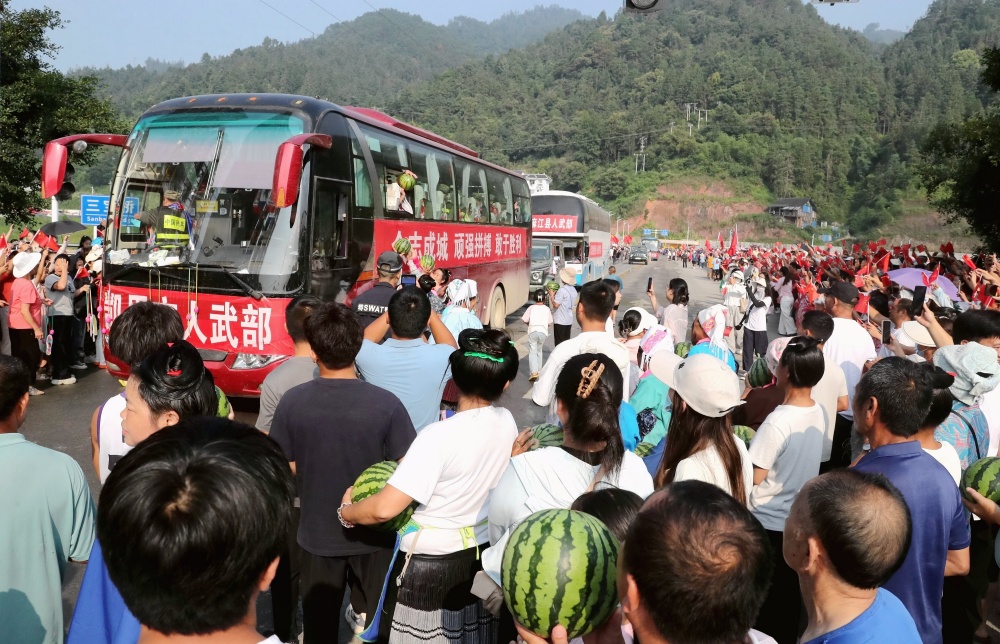 當(dāng)日上午,貴州省黔東南苗族侗族自治州榕江縣群眾自發(fā)并帶著自家種的西瓜、制作三月粑、包糯米飯、煮紅雞蛋以及親手繡的鞋墊等,排隊送別最后一批抗洪搶險救援的民兵隊伍。她們將自己帶來的禮品往車?yán)锶源吮磉_感激之恩,在高呼感謝聲中向救援隊伍話別,充分展現(xiàn)濃濃的軍民魚水情。