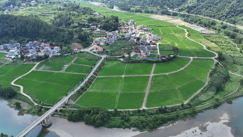 譚亮華查看制種水稻秧苗的周坪村,是岑鞏縣雜交水稻制種產(chǎn)業(yè)的核心區(qū)。這里,龍江河如翡翠綢帶繞村蜿蜒,將壩區(qū)分割成一個(gè)個(gè)獨(dú)立的“生態(tài)隔離艙”。