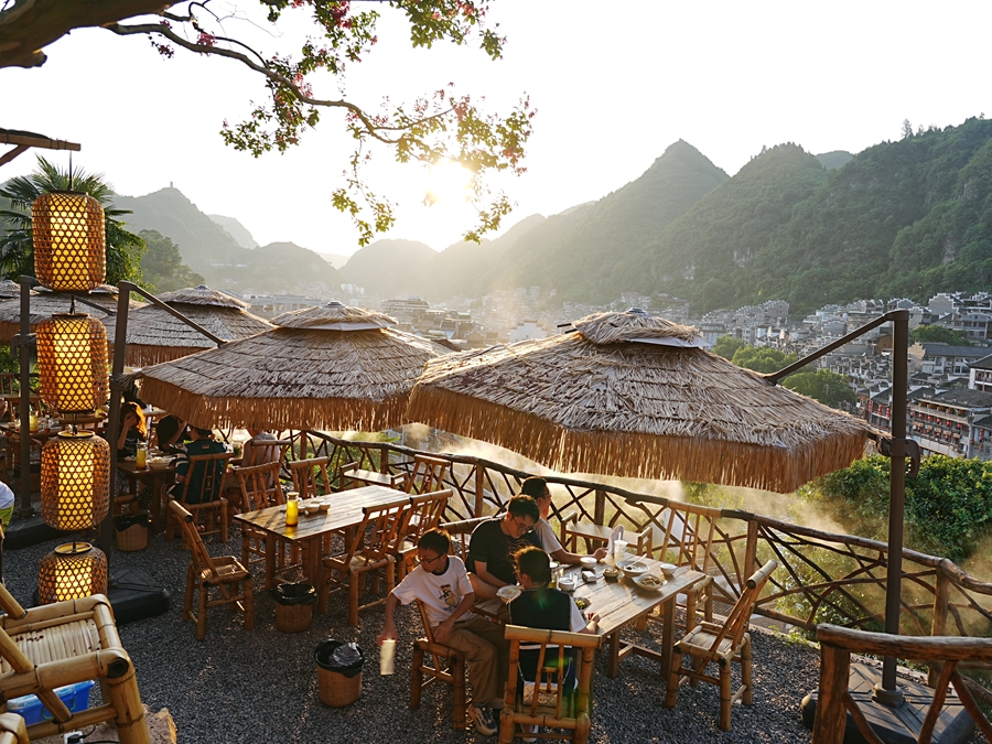 傍晚時分,兩岸的青山綠水,古城的青磚黛瓦,在落日余暉的映照下,構成了一幅如詩如畫的畫卷?!拔覀儗iT選在日落時分來這里,一邊品嘗著美味的菜肴,一邊欣賞著壯麗的落日景色,感覺所有的疲憊都煙消云散了。”廣東游客劉女士感嘆。