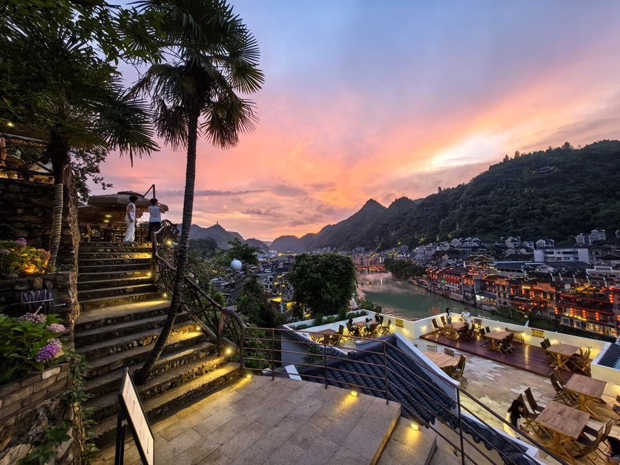 餐廳坐落于鎮(zhèn)遠古城的半山腰上,依山傍水,團隊從設計之初便精確計算了每一處露臺與夕陽的角度關系,確保山河落日成為永不落幕的“主菜”。
