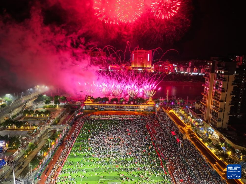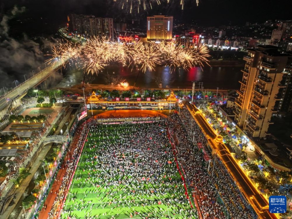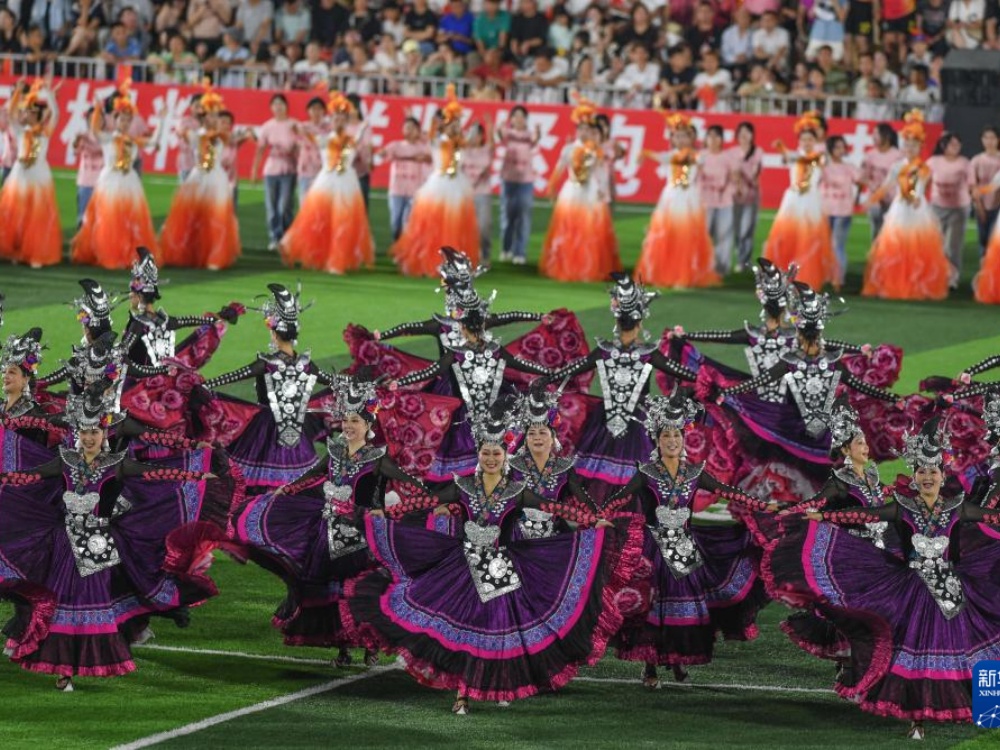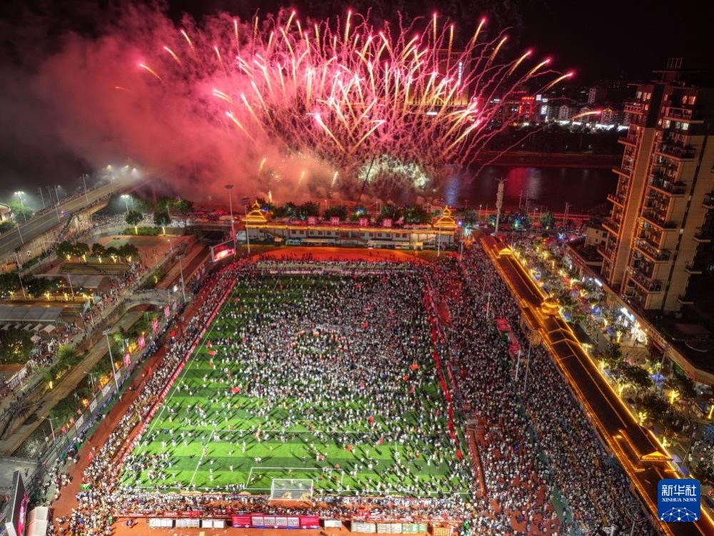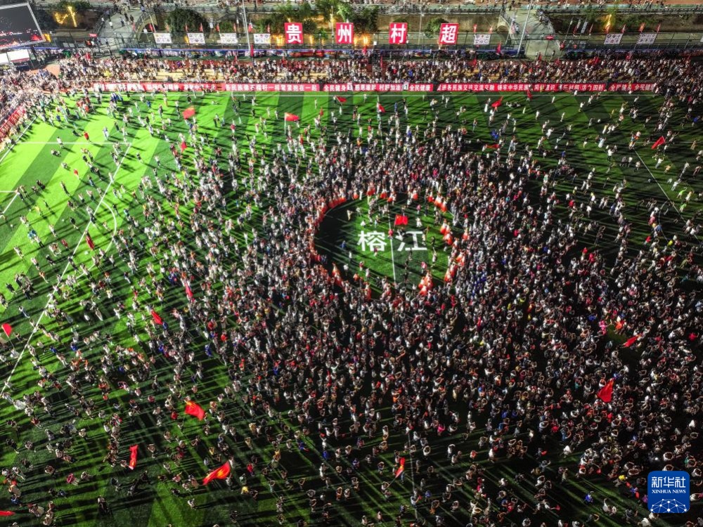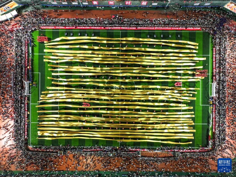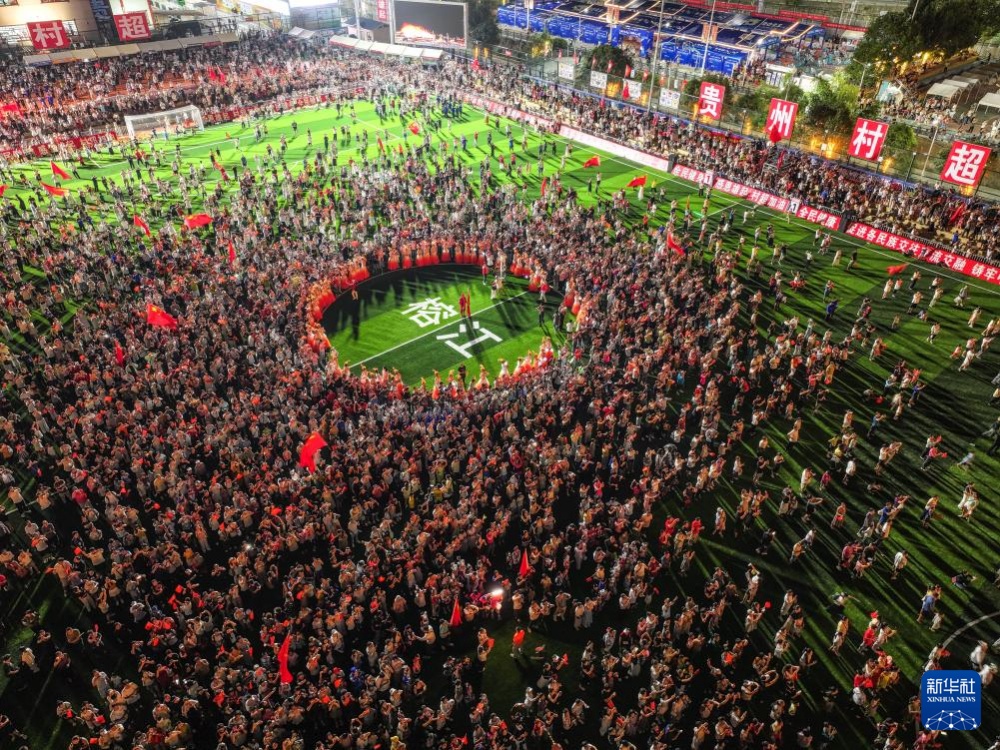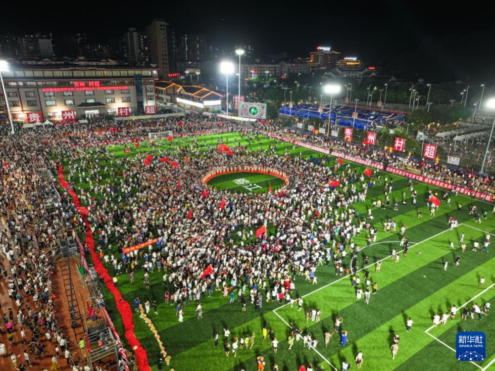 ?7月26日,活動(dòng)結(jié)束后,人們涌向貴州“村超”球場(chǎng)一起跳民族舞蹈“多耶”(無人機(jī)照片)。