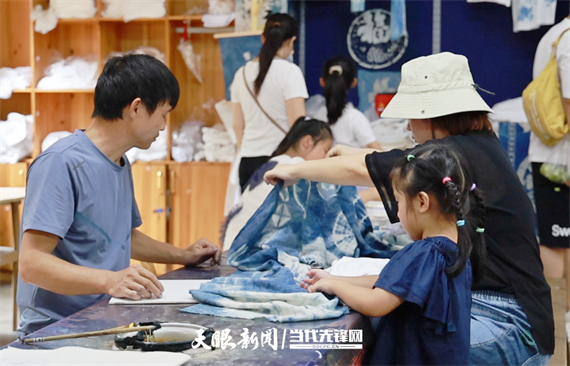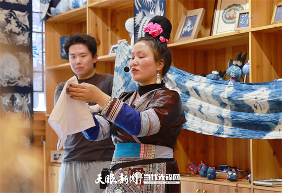 走進位于肇興侗寨內(nèi)的侗品源靛染文化體驗館,只見藍白相間的靛染布料在陽光下格外醒目,幾位繡娘正端坐于木桌前飛針走線;不一會兒,指尖下的侗錦圖案漸顯雛形。